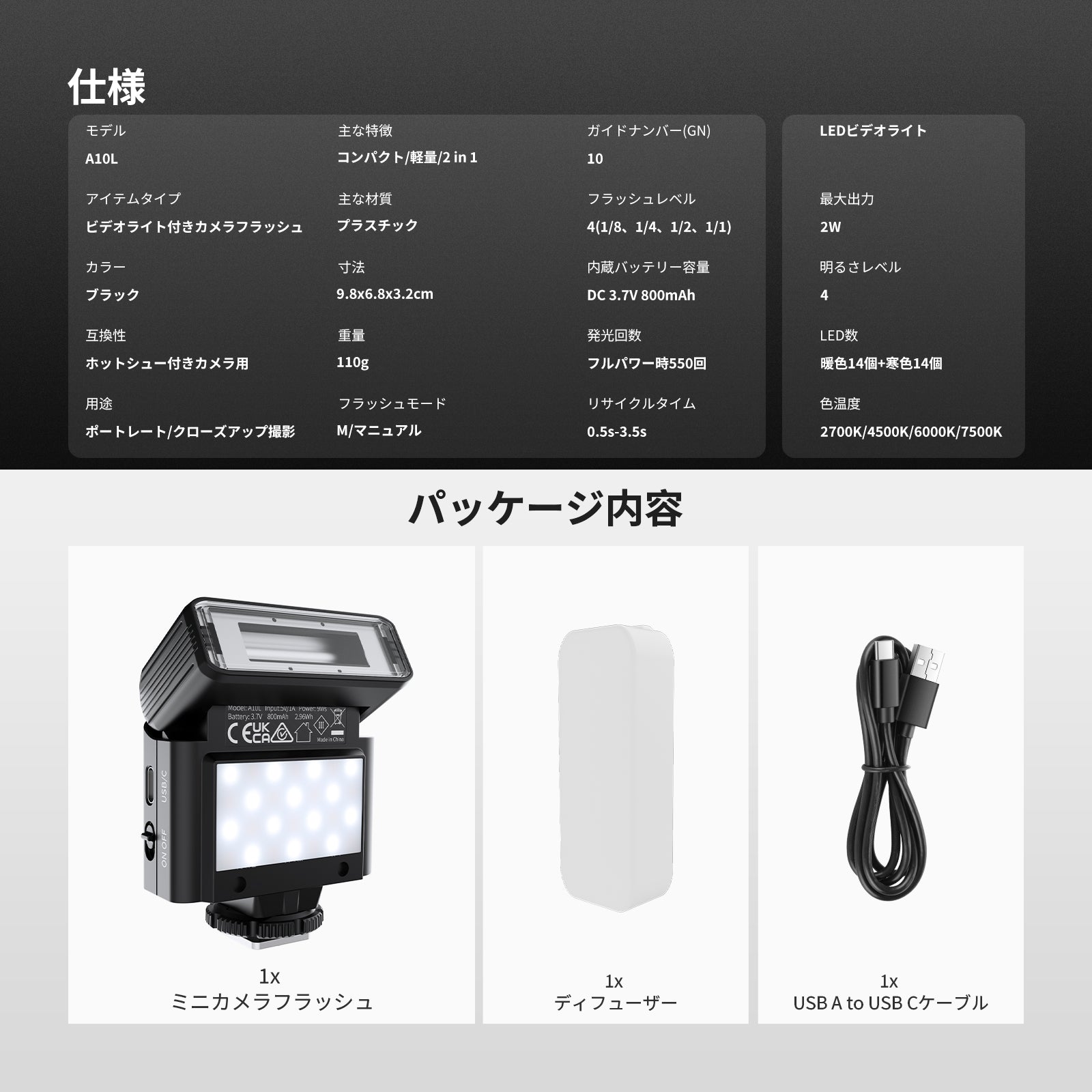 - 【2 in 1 フラッシュ&ビデオライト】A10Lは単なるフラッシュではなく、4段階色温度調整機能、4段階調光機能(連続発光)、95+高演色性(CRI)を備えた2W LEDライトとしても機能します。コンテンツクリエイターやインフルエンサーにとって、低照度環境、ポートレート、静物、商品撮影、スタジオ撮影、クローズアップ、屋外撮影などクリエーションに必要なアイテムです。