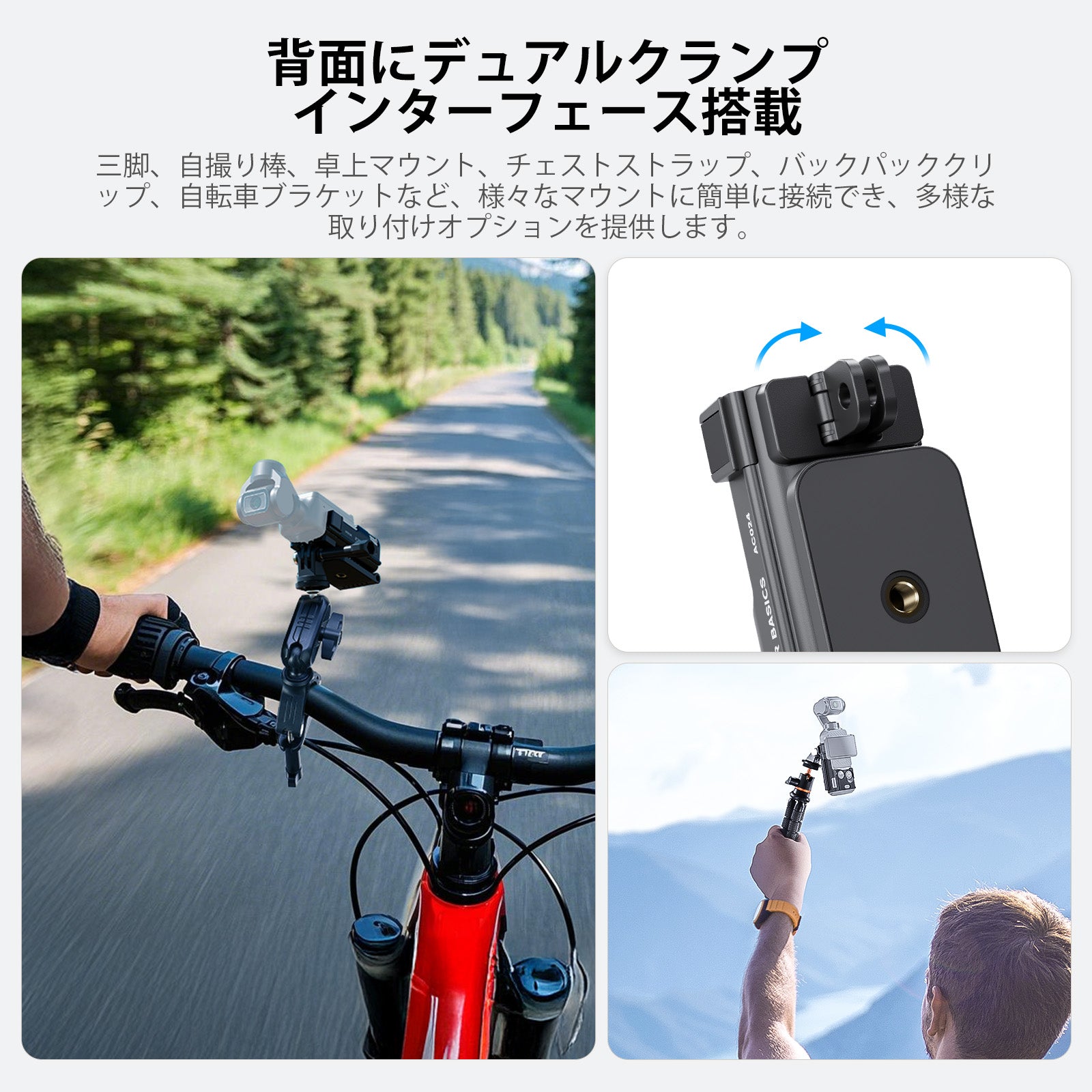 【1/4"ネジ穴&2つクランプインターフェース】Pocket 3ケージホルダーは、サポートベースに標準1/4"ネジ穴、背面に2つクランプインターフェースを備え、三脚、自撮り棒、卓上マウント、チェストストラップマウント、バックパッククリップ、自転車ブラケットなどアクセサリーに簡単に接続し、様々な撮影シーンに合わせて柔軟で安定したマウントオプションを提供します。