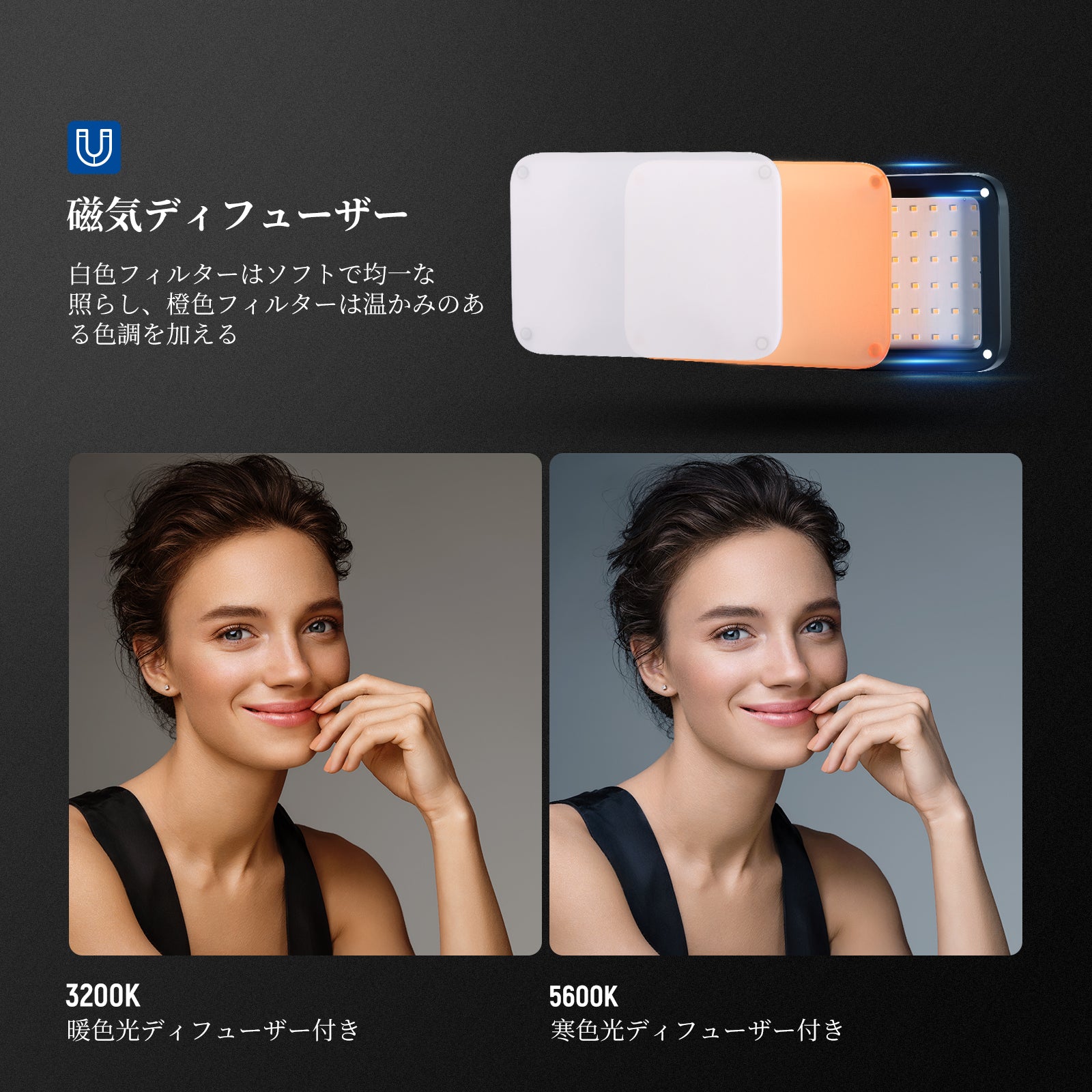 - 【柔軟な光調節&フィルターオプション】 BP66 LEDビデオライトは10段階の調光機能を搭載。タップ操作で段階調光、長押しで連続調光が可能です。標準白色フィルターが柔らかく均一な照明を実現し、オレンジフィルターが被写体に温かみのある色調を加えます。磁気設計により、フィルターの交換はワンタッチで簡単です。