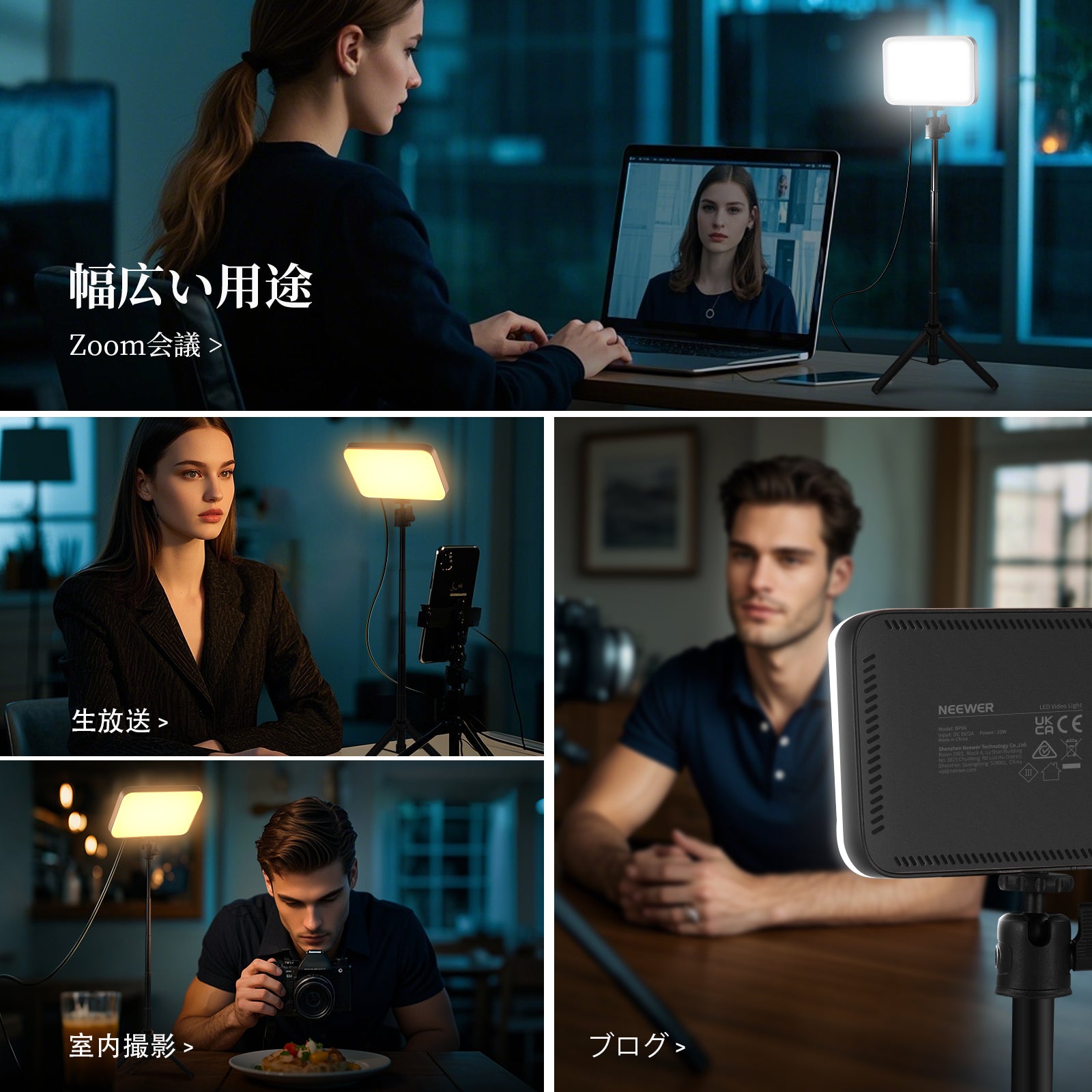 - 【バイカラー調色でプロ級光質】BP66 LEDパネルライトは、高品質の66個LEDを搭載、10W高輝度、0.5m距離での最大照度750ルクスを実現します。バイカラー調光(3200K/5600K)とCRI95+の高演色性で、肌の質感を自然に再現します。マグネット式カラーフィルター付きで暖色/寒色の均一な光を生成。メイク照明/自撮り補助光、TikTok/YouTube動画撮影、生配信/ポッドキャスト収録、Zoom会議/ビデオ通話、商品写真/スタジオ撮影など、マルチシーン対応します。