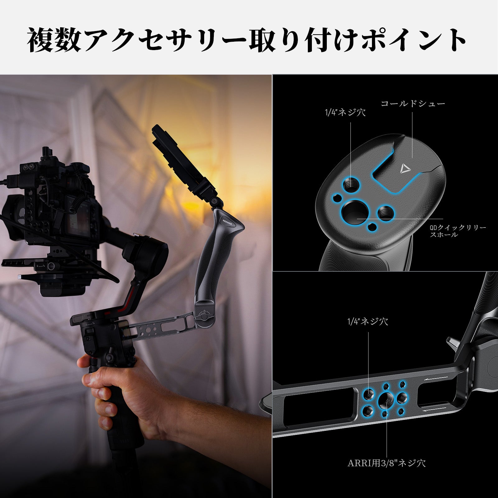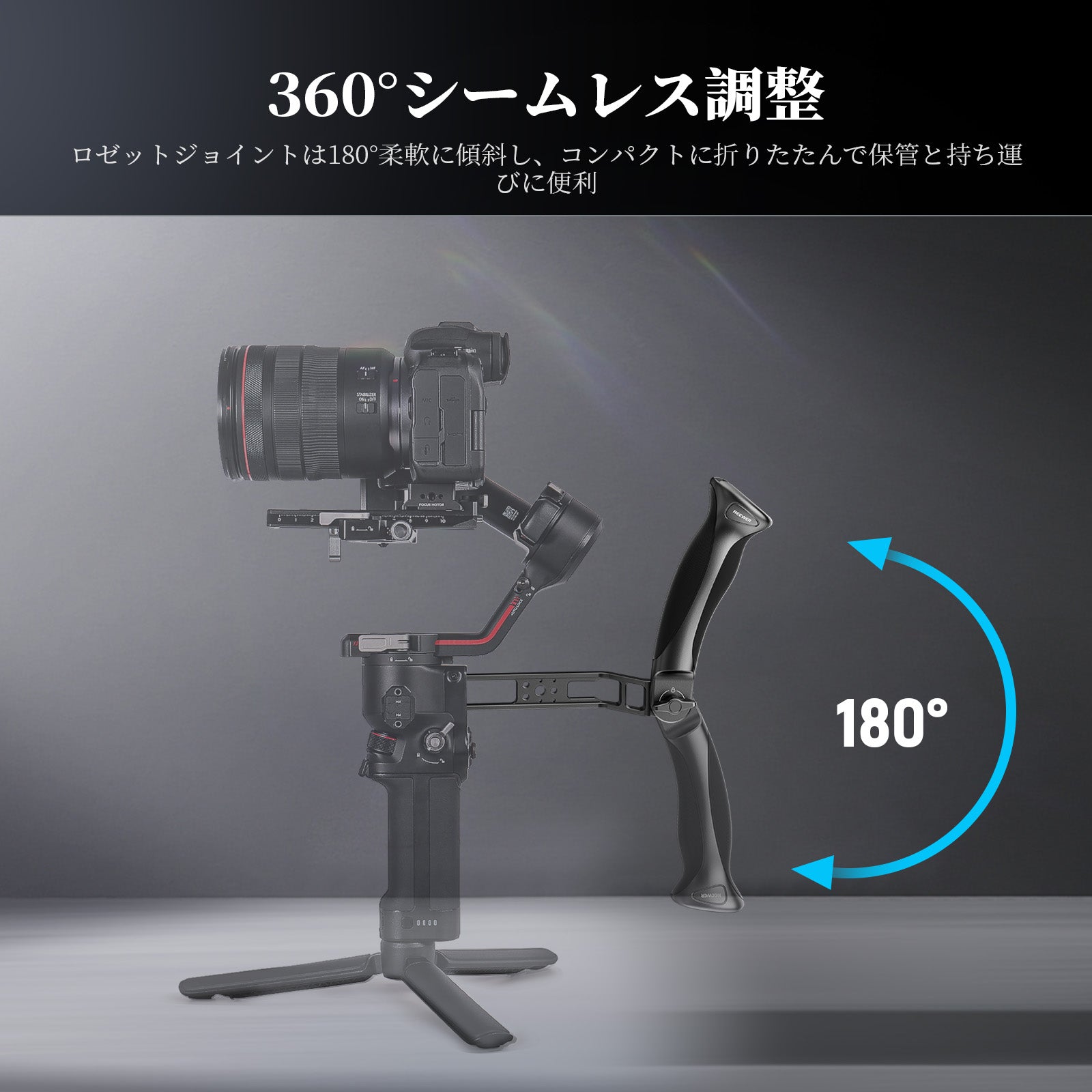 - 【360°シームレス調整】角度付きグリップは360°摩擦ギアジョイントを備えており、ジョイント部分で360°水平回転が可能で、スタビライザーとのシームレスな互換性を確保し、多彩な撮影角度を実現します。ローアングルのクローズアップ撮影でも、ハイアングルのパノラマ撮影でも、ハンドグリップは様々なクリエイティブなニーズに合わせて簡単に調整できます。