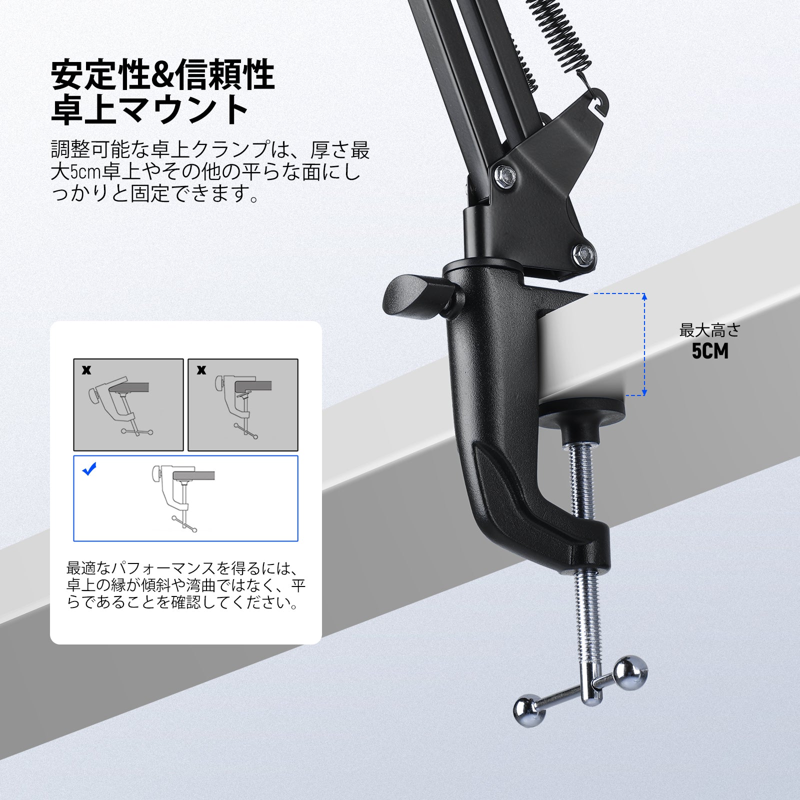 【安定性&信頼性の高い卓上マウント】卓上クランプは、調整可能で、厚さ最大5cm卓上やその他の平らな面にしっかりと固定します。滑り止めゴムパッドは卓上を傷から保護し、最適なパフォーマンスを得るには、卓上の端が平らで、傾いていないか曲がっていないことを確認してください。