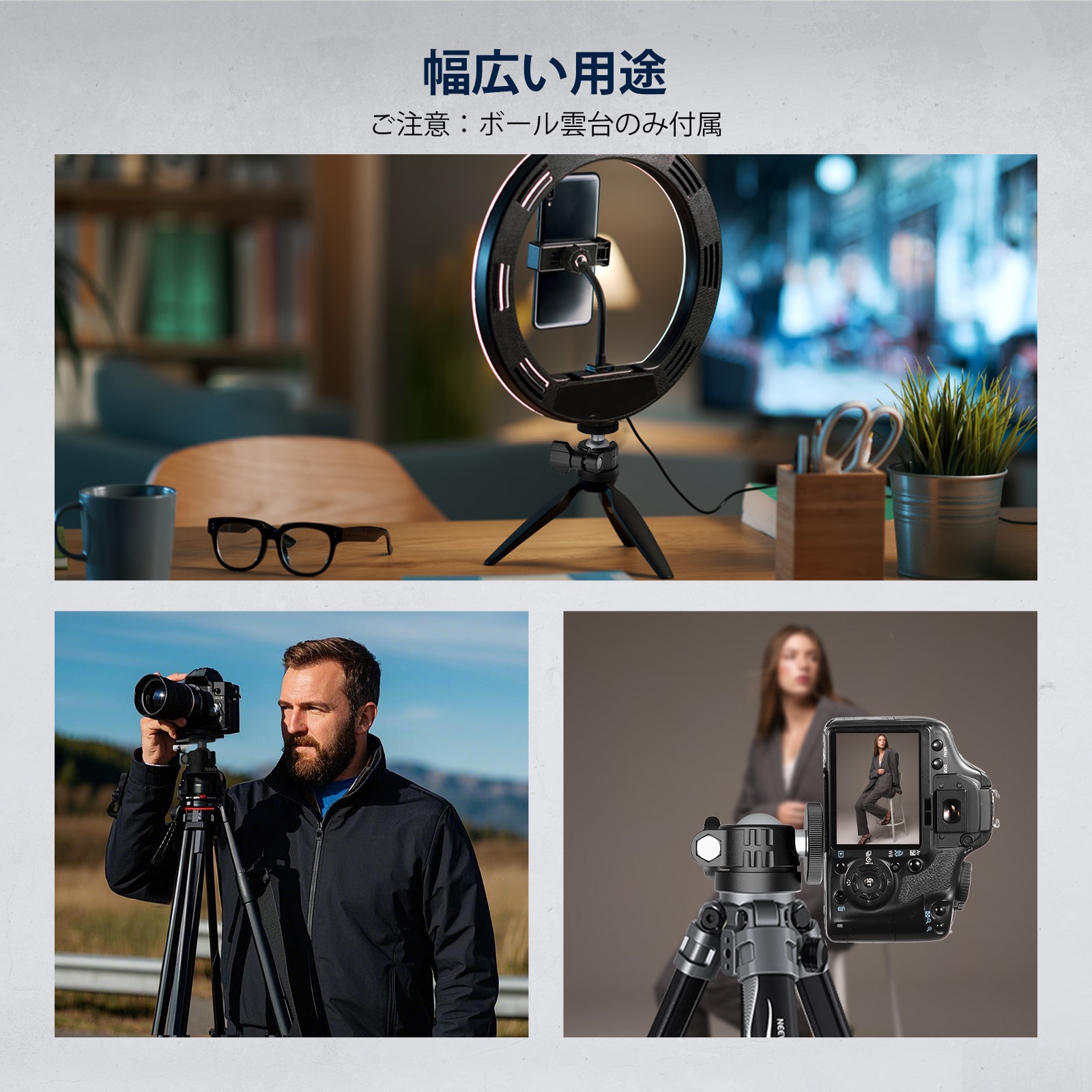 - 【1/4"汎用互換性】1/4"取り付けネジは、コンパクトカメラ、ミラーレスカメラ、小型DSLRカメラ、スマホホルダー、アクションカメラアダプター、LEDリングライト、マイクなどの三脚アクセサリーと写真/ビデオ撮影ギア(全て別売)を対応します。最大荷重2kgです。