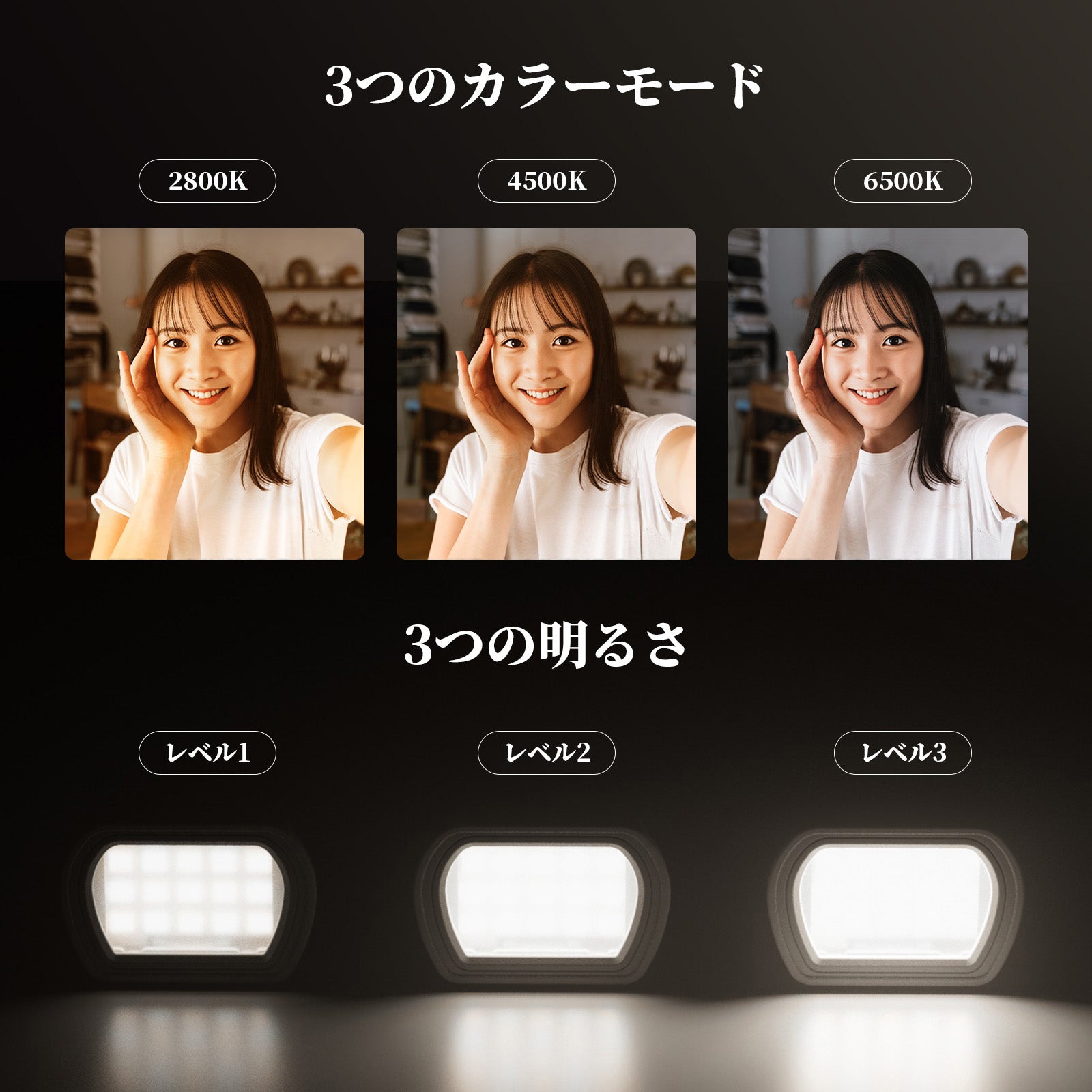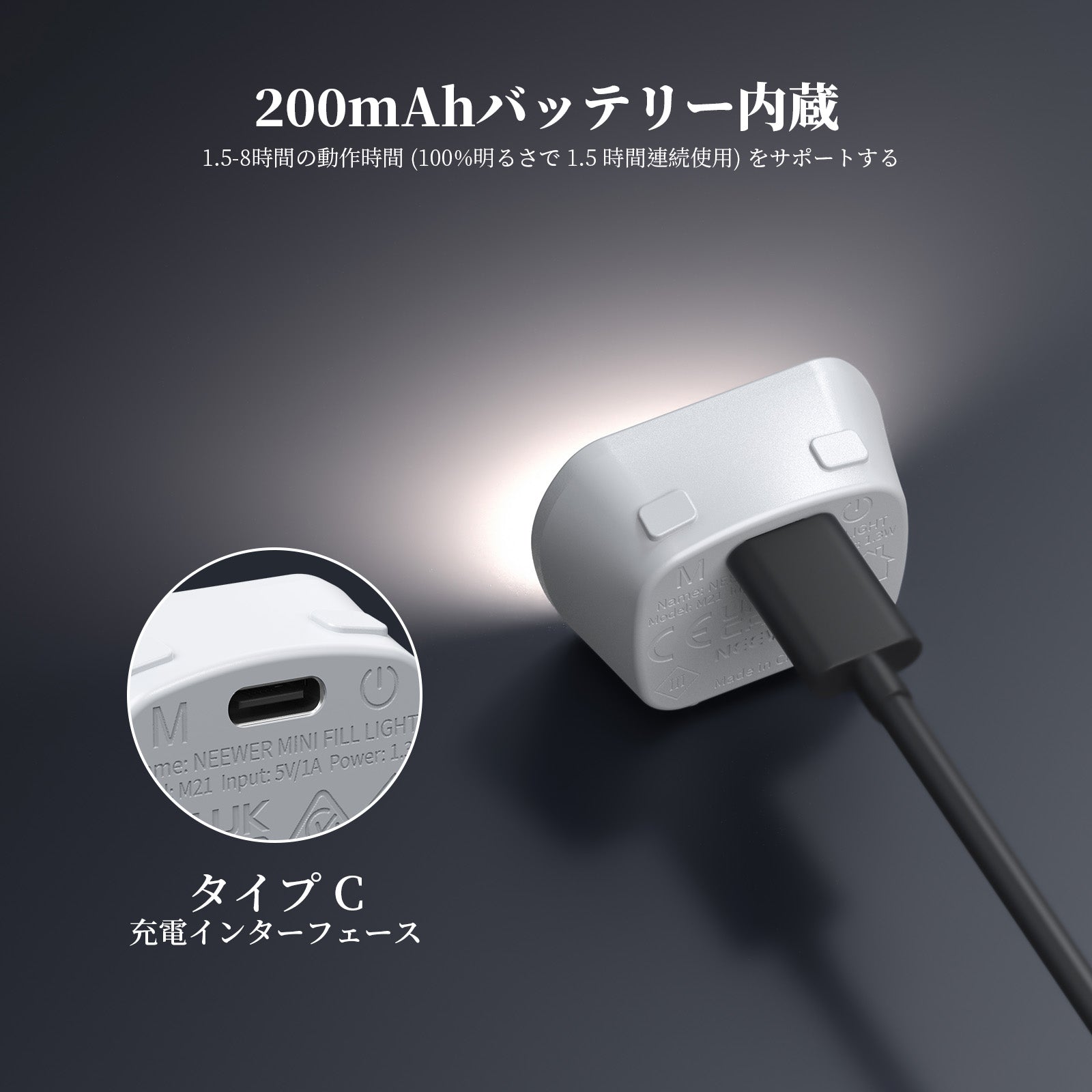 【バッテリー内蔵&素早く充電】200mAh充電式バッテリーを内蔵。最大輝度時で1.5時間、省エネモード時には最大8時間の使用が可能(使用条件により異なります)。USB Cポート対応でモバイルバッテリーやその他USB電源から素早く充電でき、長時間の撮影をしっかりサポート。