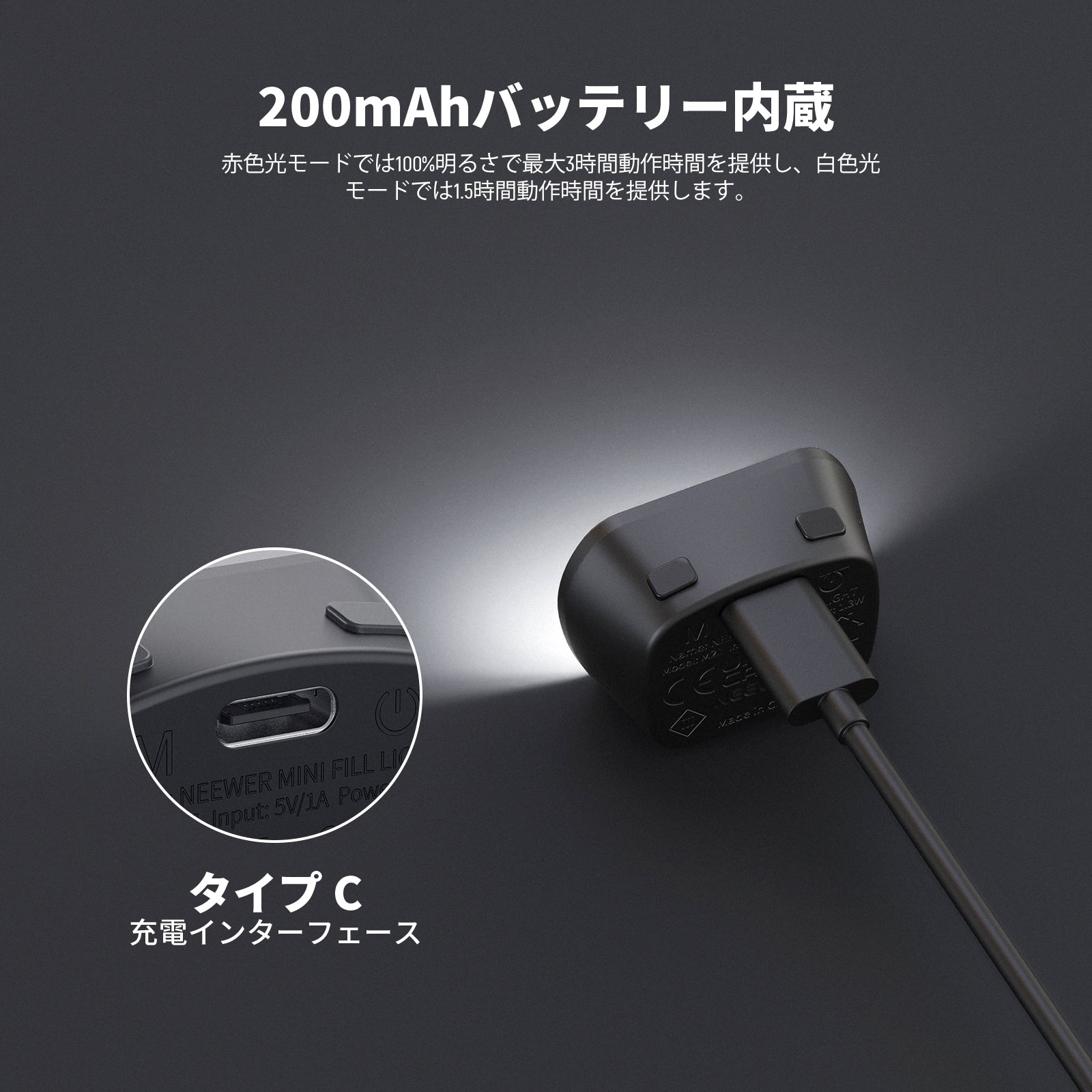 【最大3時間駆動&素早くフル充電】LED自撮り補助ライトは、200mAh充電式バッテリーを内蔵し、赤色光モードで100%明るさで最大2時間、白色光モードで最大1時間駆動します。USB Cポート(ポータブル充電器など)でわずか66分でフル充電できます。