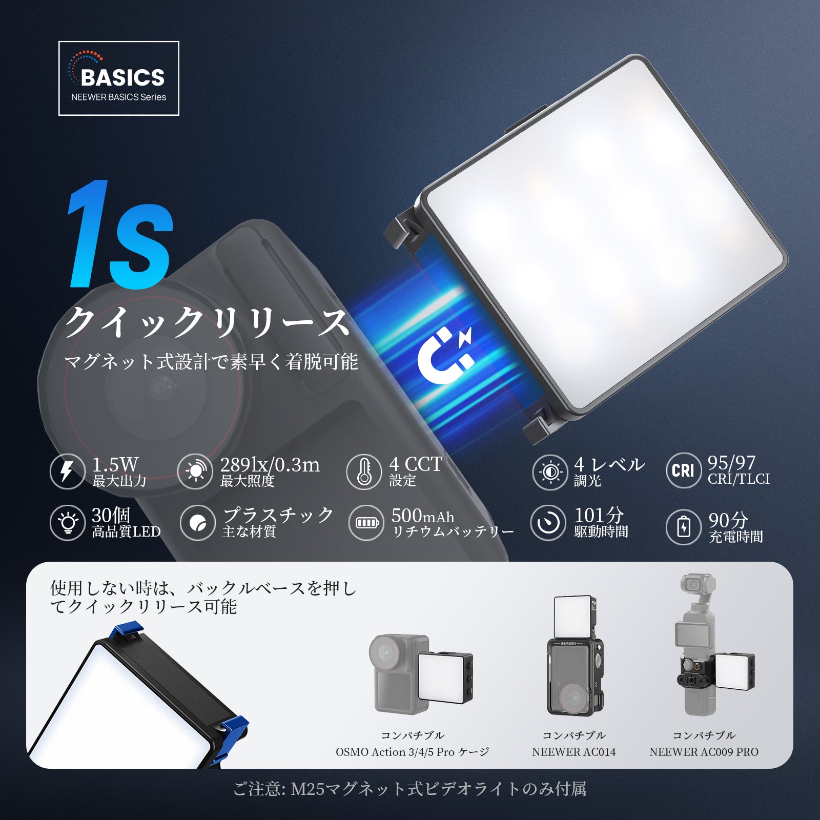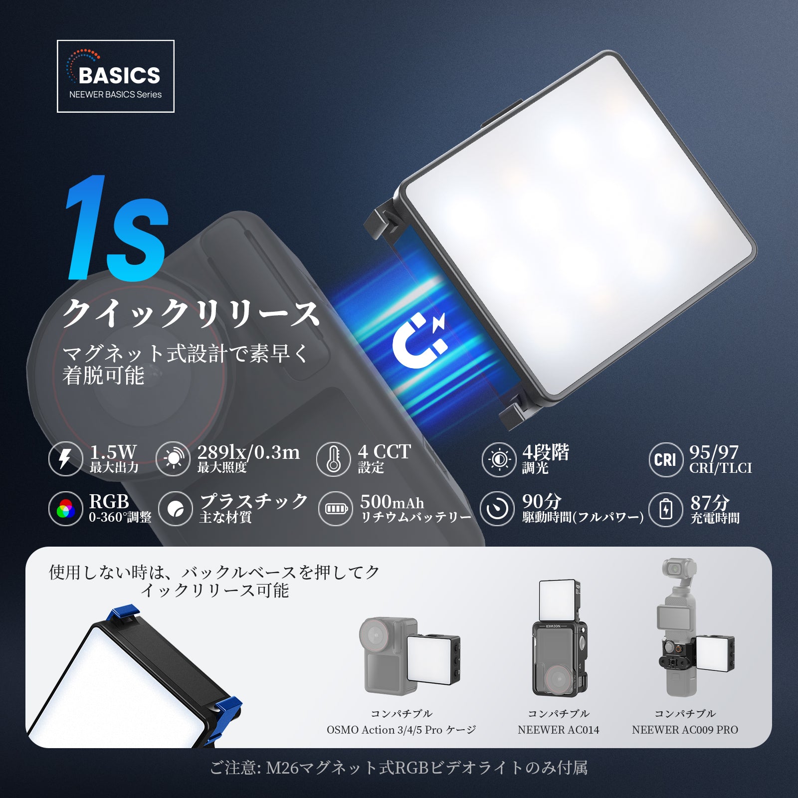 - 【クイック磁気設置】強力サイドマグネットとプラスチック製ロックバックルにより、カメラケージへの着脱が瞬時に完了。NEEWER AC009 PROケージ(OSMO Pocket 3及びクリエイターコンボアクセサリー対応)との高い互換性を実現。外出先でのVlogビデオ撮影や旅行動画に最適なカメラ写真照明です。