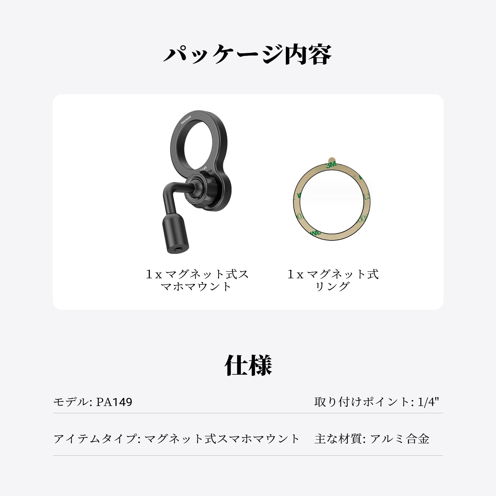 - 【マグネット式スマホマウント&1/4"ネジ】マグネット式スマホ三脚アダプターマウントは、スマホを三脚スタンドマウント、自撮り棒、スタビライザーに取り付けられます。コンテンツクリエイターやインフルエンサーにとって、写真撮影用アクセサリーや機材は必要です。