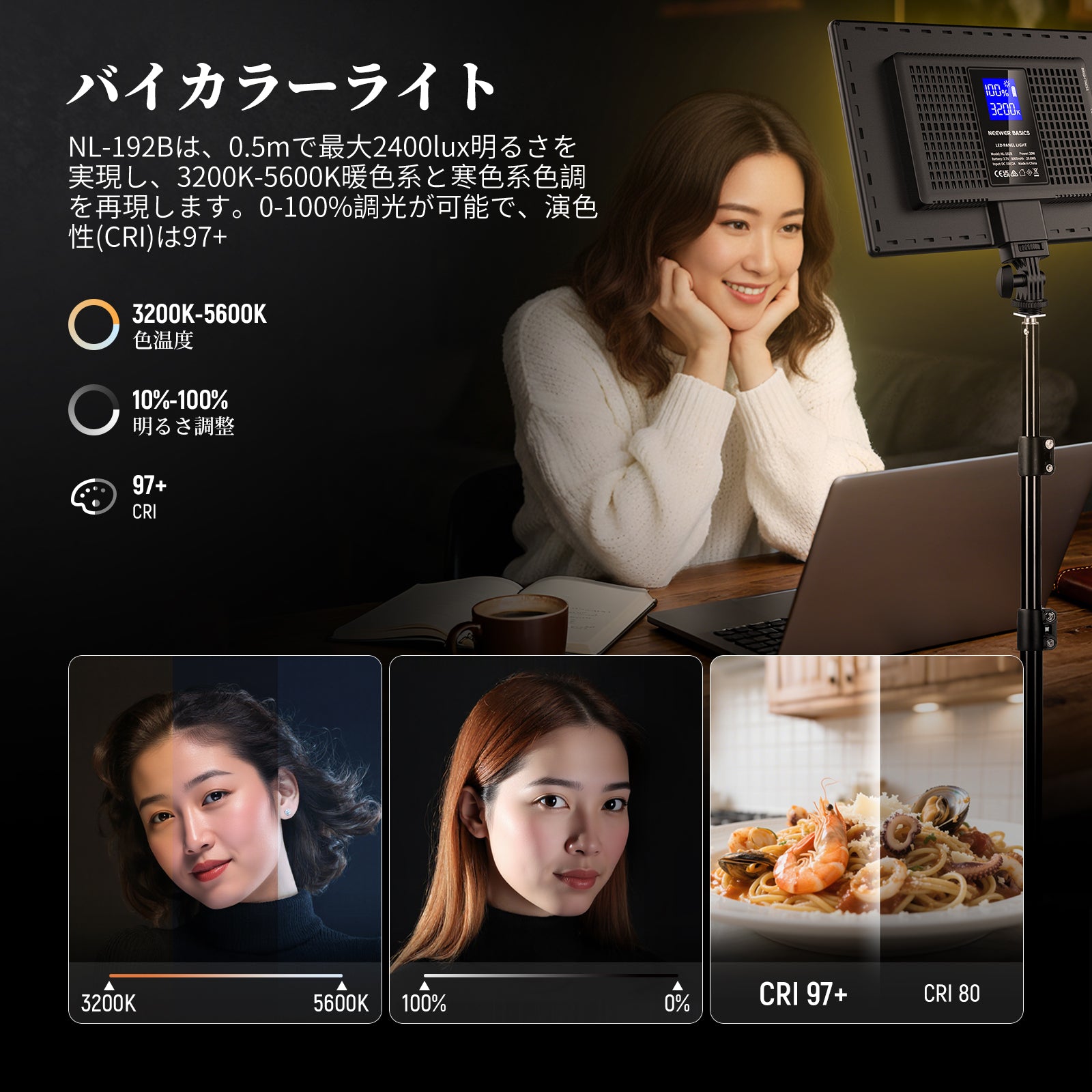 - 【バイカラーLEDビデオライト】192個のウォームイエロー&クールホワイトLEDを備えたNL-192Bは、最大2,400lx/0.5mで、3200K-5600Kでウォーム&クールトーン、0~100%の調光範囲、CRI97+で高い色精度を実現します。 ポートレート写真、YouTube/TikTok撮影、スタジオ撮影、ソーシャルメディアライブストリーミング、インタビュー、理髪店など用のポータブルソフトキーまたはフィルパネルライト。コンテンツクリエーター、インフルエンサー、ライブストリーマー、メイクアップアーティストにとって不可欠な照明器具です。
