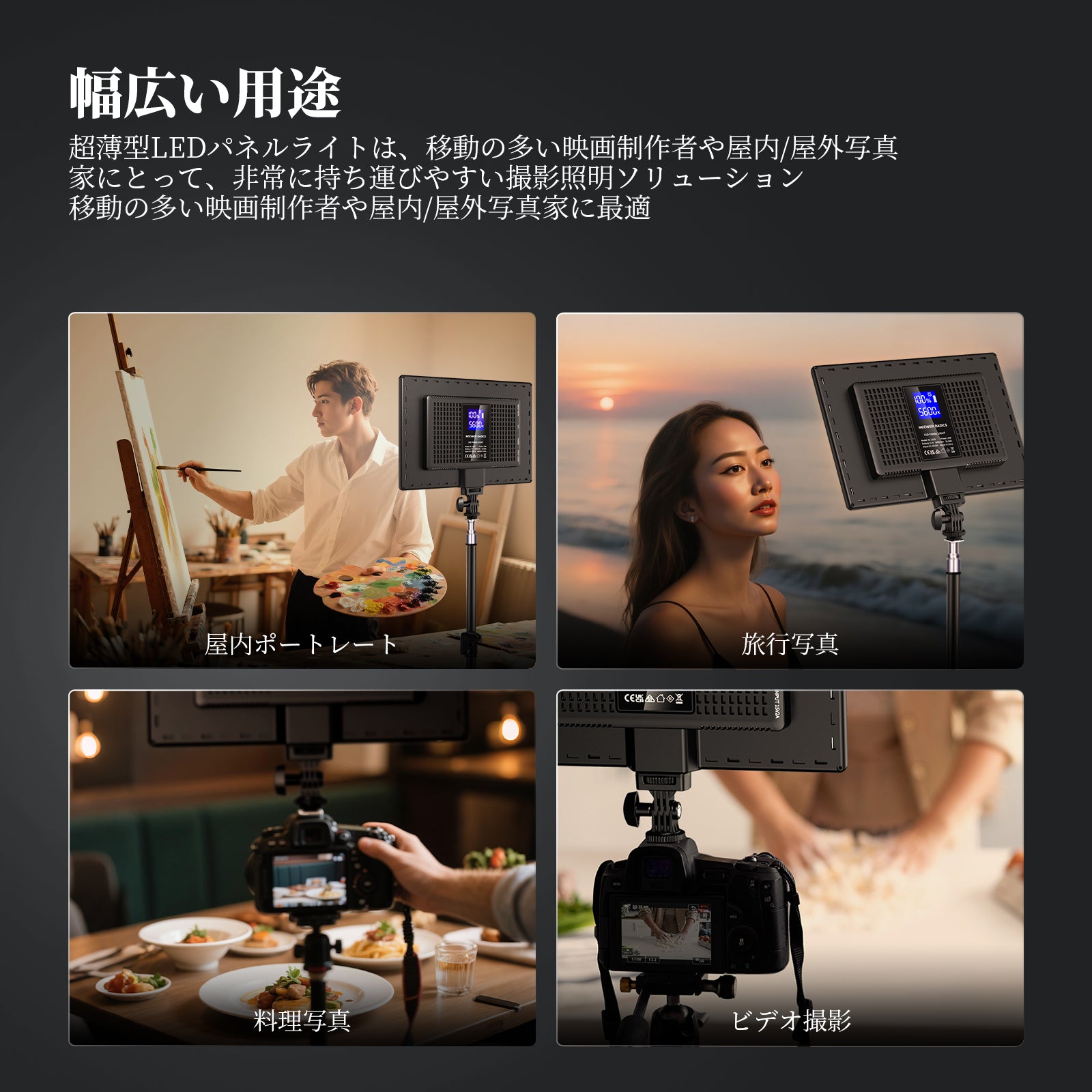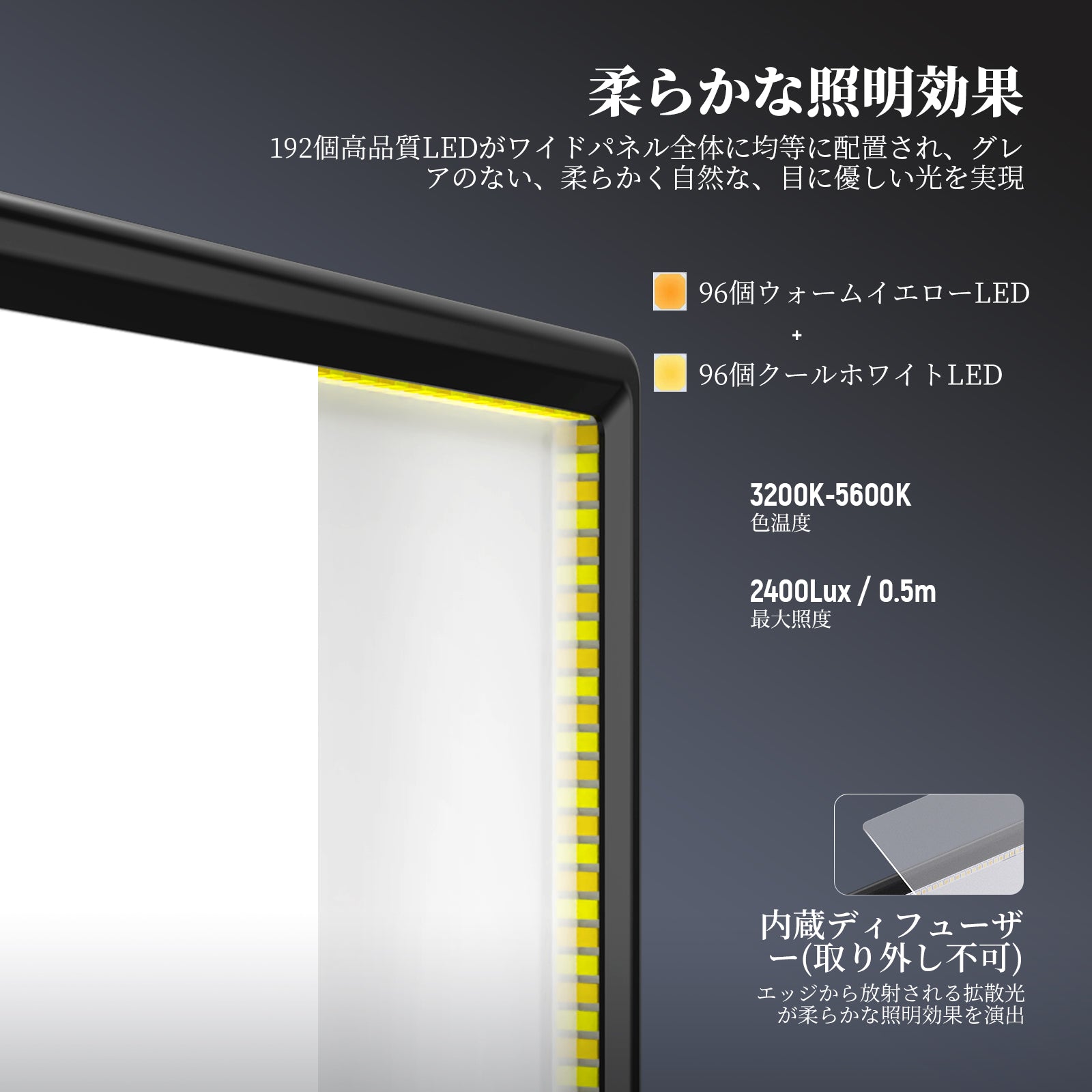 - 【プレミアム&ソフトパネル照明】192個のプレミアムLEDは、10.55インチx1インチx7.4インチ/26.8x2.6x18.8cm(対角13インチ)幅の広いパネルに均等に分配され、柔らかく、自然で、目に優しい光で、まぶしさはありません。 影を最小限に抑え、暗いコーナーを減らし、広い光をカバーします。 ライトヘッドの背面にあるHD LCDスクリーンは、色温度、明るさ、バッテリーの状態を明確に表示し、簡単に監視できます。