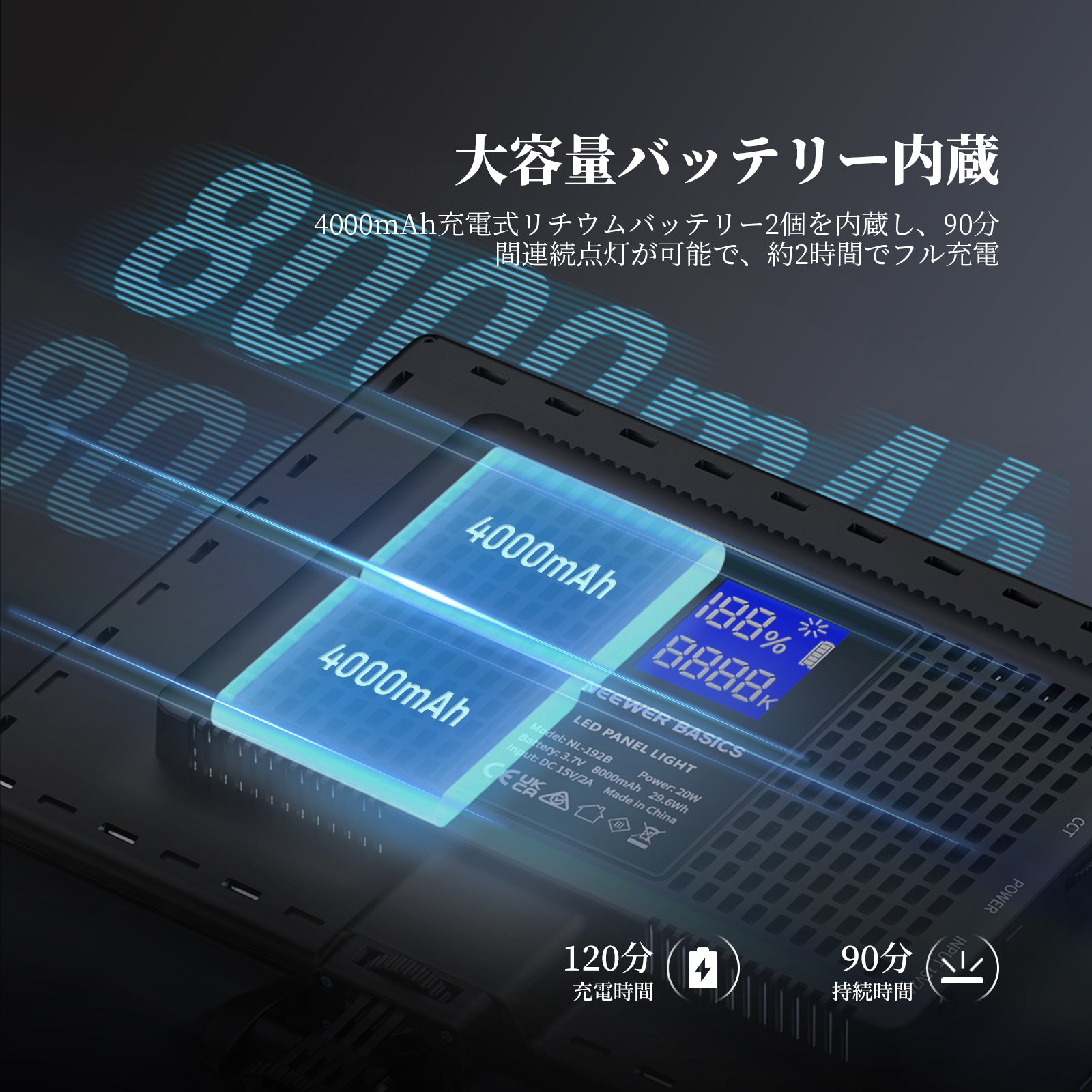 - 【8000mAhリチウム電池内蔵】このスタジオ撮影およびビデオ撮影用照明器具は、2つの内蔵4000mAh充電式リチウム電池で駆動するため、電源が届かない場所での撮影に最適です。 外出先でのコンテンツ作成に最大90分間の連続照明を提供し、付属の電源アダプターによる15V 2Aの高速充電をサポートし、約2時間でフル充電します。