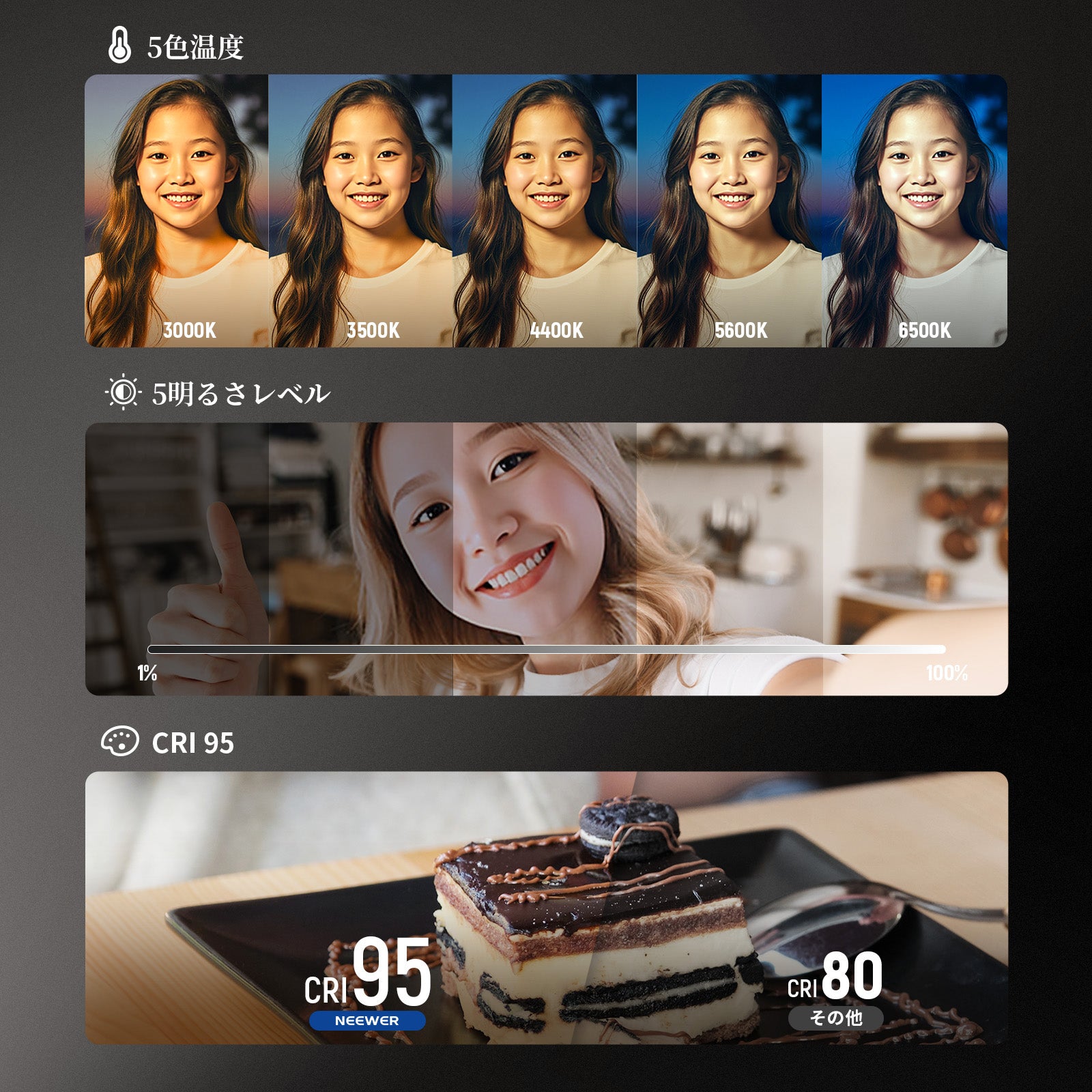 - 【NEEWER BASICS シリーズ】NEEWER BASICS シリーズは、シンプルで実用性に優れたシリーズで、基本的な機能とデザインに基づいて、不要な追加機能や素材がありません。NL48R撮影用ライトは、48個高品質LEDを搭載し、1160lx/0.2m照度を提供し、色温度と明るさを調整可能で、超コンパクトで持ち運びに便利です。CRI95明るさで、肌色を明るくし、顔のシミを軽減し、カメラ映りを良くします。
