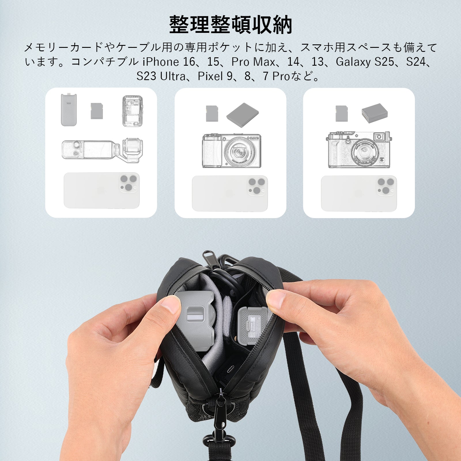 - 【Pocket 3用旅行バッグ】カメラバッグはコンパチブル Pocket 3で、取り外し可能な仕切りを備え、Vlog用カメラとバッテリーを整理して収納できます。取り外した状態でも小型DSLRカメラを収納できる十分なスペースも保証しています。2つメモリカード用の専用ポケット、内側にメッシュポケット、2つ外側にケーブル用のポケット、そしてスマホ専用エリアも備えており、コンパチブル iPhone 16、15、Pro Max、14、13、Galaxy S25、S24、S23 Ultra、Pixel 9、8、7 Pro。