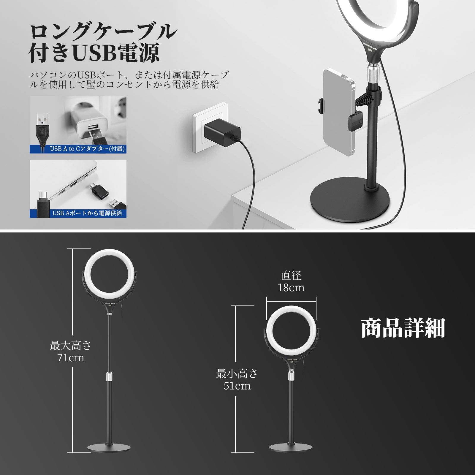 リングライト直径: 7"/18cm