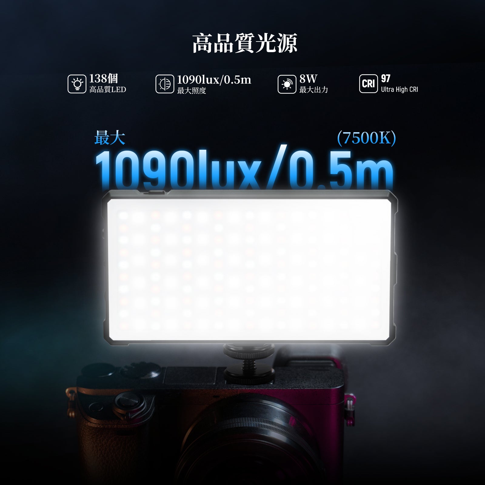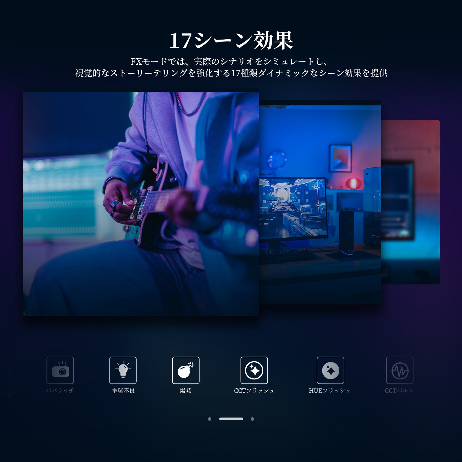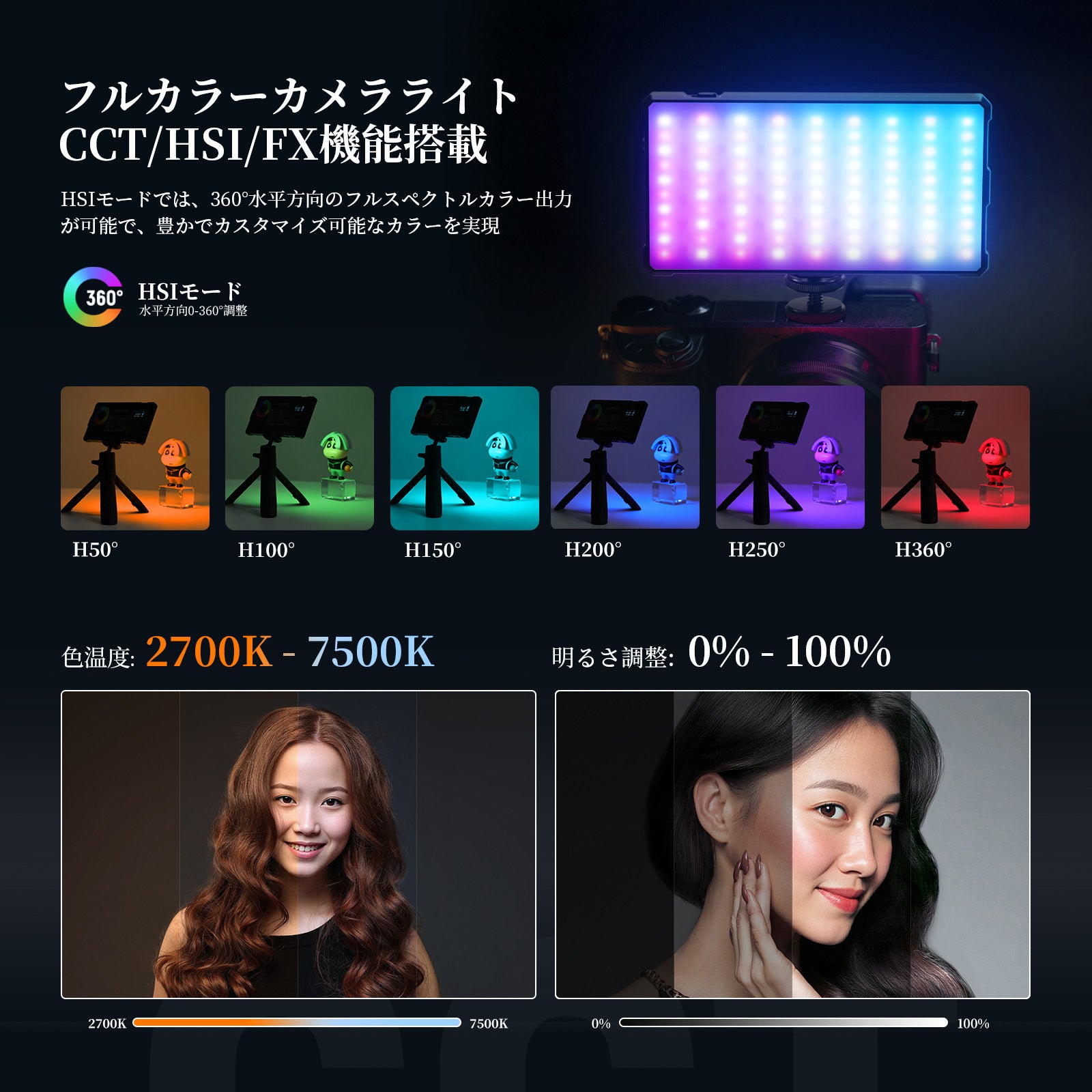 - 【CCT/HSI/FXモード】ウォームLED45個、クールLED45個、RGB LED48個をブレンドしたこのオンカメラライトは、最大984lux/0.5m の明るさを実現し、3つの照明モード(CCT/HSI/FX) に対応しています。CCTモードでは、色温度を2700K〜7500Kの範囲で調整でき、明るさは0〜100%で無段階制御可能です。HSIモードでは、360°の色相選択によるフルスペクトルのカラー出力が可能で、豊かでカスタマイズ可能なトーンを実現します。FXモードでは、17種類のダイナミックシーンエフェクトを搭載し、実際のシーンをシミュレートして視覚的なストーリーテリングを強化します。