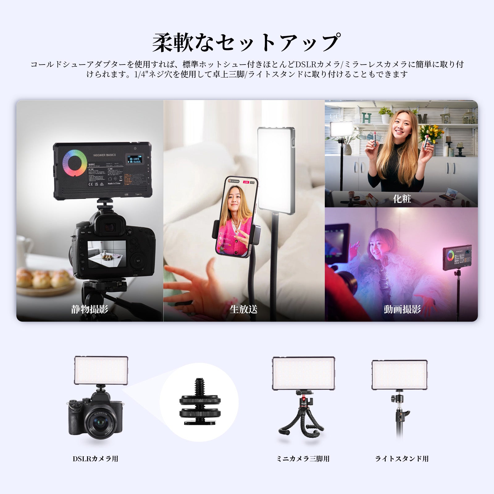 - 【柔軟なセットアップ】RGBビデオライトはコールドシューアダプターを介して、標準ホットシュー付きほとんどDSLRビデオ/ミラーレスカメラに簡単に取り付けられ、1/4"ネジ穴を介して卓上三脚スタンドにも取り付けられます。コンテンツクリエイター、化粧アーティスト、ストリーマー、インフルエンサーにとって必要なギアで、ポートレート写真、YouTube/TikTok動画、スタジオ撮影、写真撮影、生放送、静物写真、自撮り、Vlog、動画録画、ゲーム配信などに最適です。