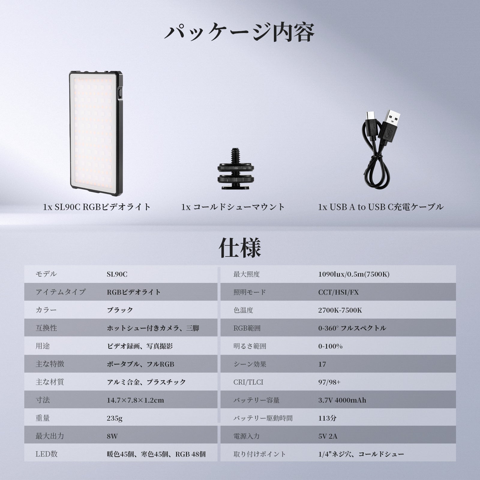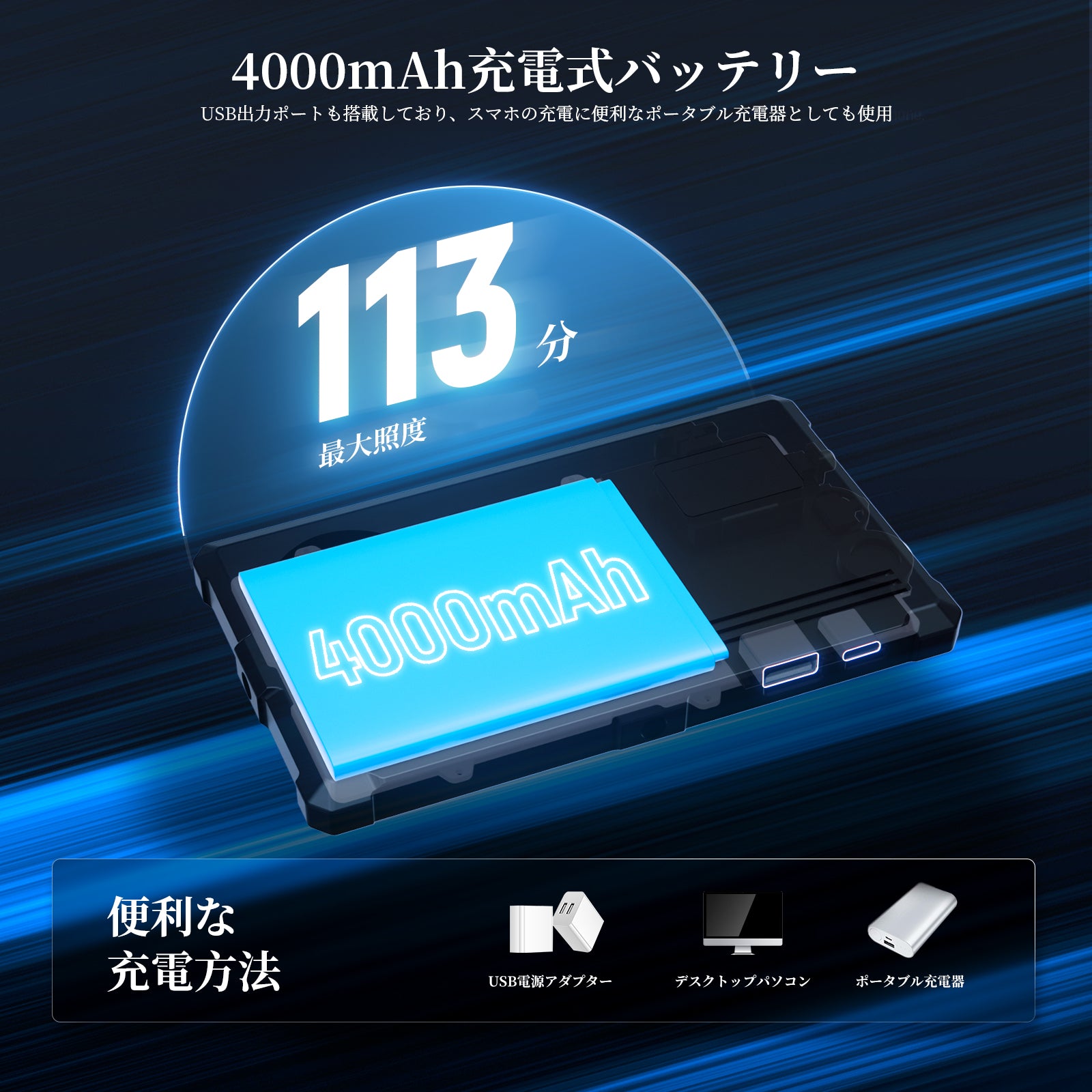 - 【4000mAh充電式バッテリー】RGBパネルライトは4000mAhリチウムバッテリーを内蔵し、最大輝度で最大113分間点灯します。ケーブルを付属し、車の充電器、ノートパソコン、その他のUSB電源で簡単に充電できます。USB出力ポートも備え、大容量バッテリーを搭載し、スマホやタブレット充電用ポータブル充電器としても使用できます。