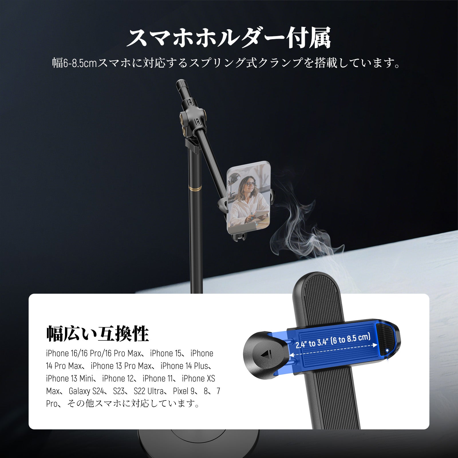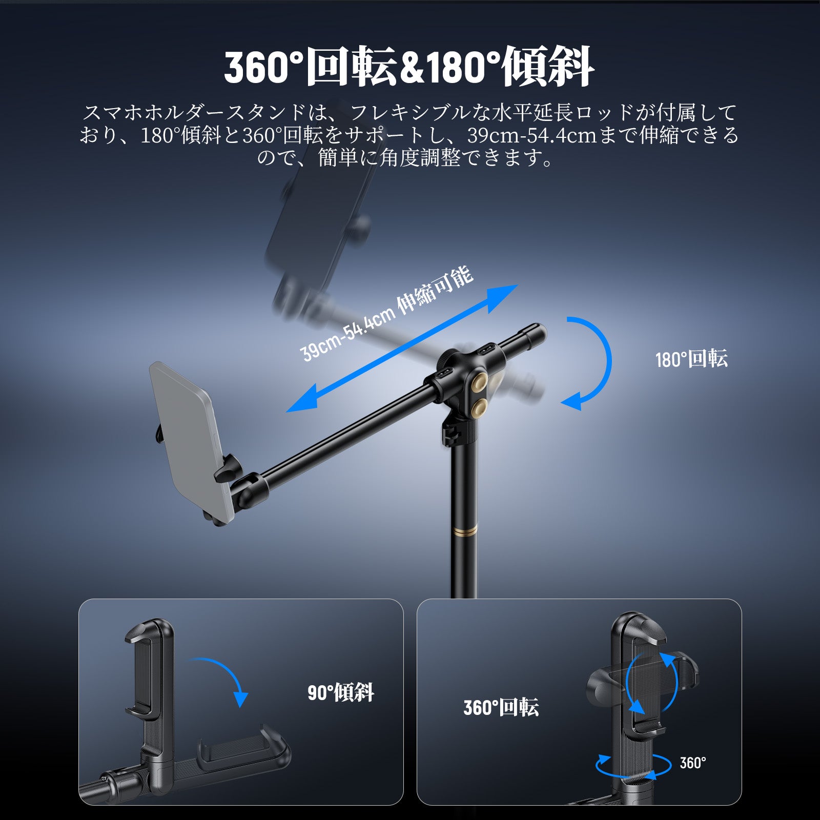 - 【360°回転&180°チルト】スマホホルダースタンドは、柔軟な水平延長ロッドが装備されており、39cm-54.4cm伸縮でき、180°チルトと360°回転もサポートし、角度調整が簡単です。設計により、横向きと縦向きの切り替えが素早く可能になり、動画鑑賞、料理中のレシピ確認、ビデオコールなど、最適な姿勢で撮影できます。