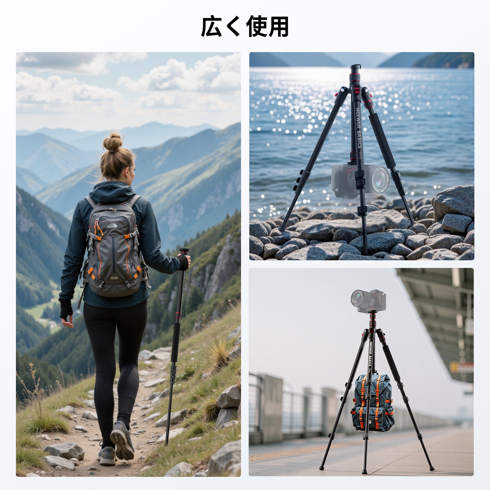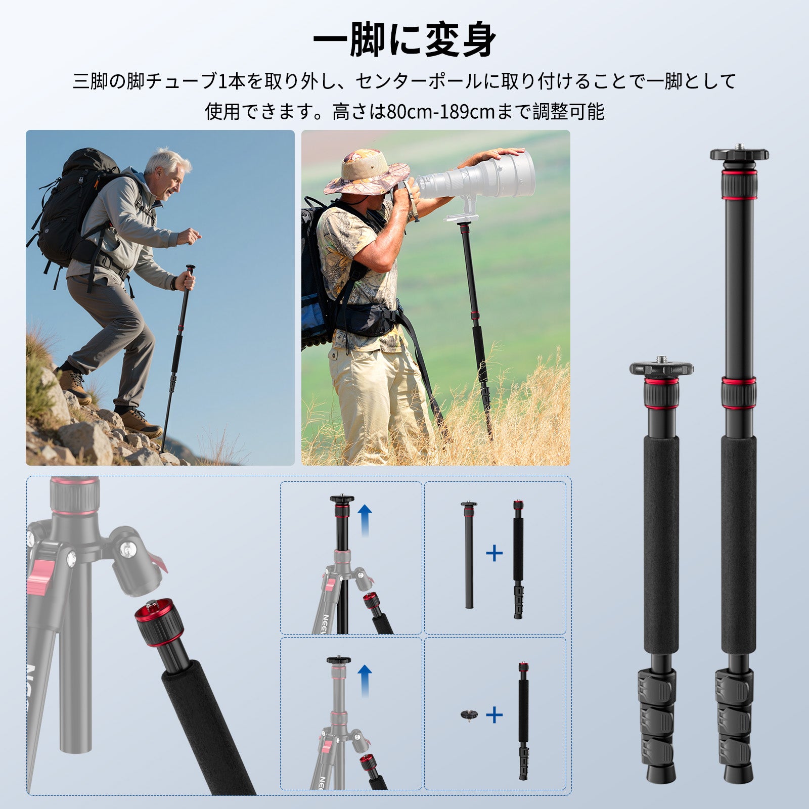 - 【一脚として使用】三脚の脚チューブの1つを取り外し、センターコラムに接続して一脚に変わり、動き速いシーン撮影に最適で、ハイキング中のトレッキングポールとしても多用途に使用できます。一脚は高さ80cm-189cmまで調整可能です。スマホホルダーも備え、 コンパチブル iPhoneアタッチメント。コンテンツクリエイターやインフルエンサーにとって必要な写真やビデオ撮影アクセサリーとして、カメラ制作に必要なツールとして最適です。