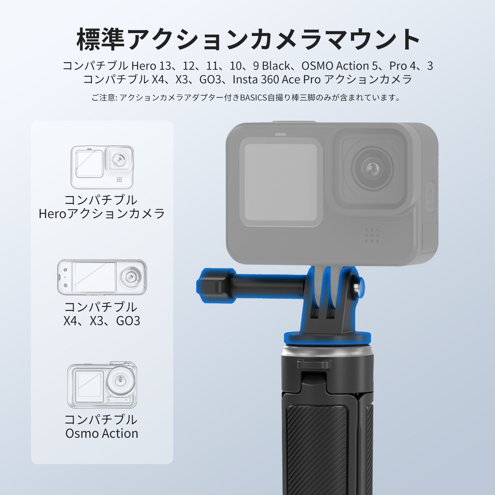 - 【アクションカメラ用三脚スタンド】自撮り棒はコンパチブル Hero 13/Go Pro 12/11/10/9 ブラック、OSMO Action 5 Pro/4/3、Insta360 X4/X3/GO3 Insta 360 Ace Proアクションカメラ、Osmo Pocket 3ハンドルなど。また、スマホホルダーや、モニター、フィルライト、マイクなどの写真撮影/ビデオ撮影用アクセサリー、ギア、機材(すべて別売)を取り付けて、多目的に使用できます。