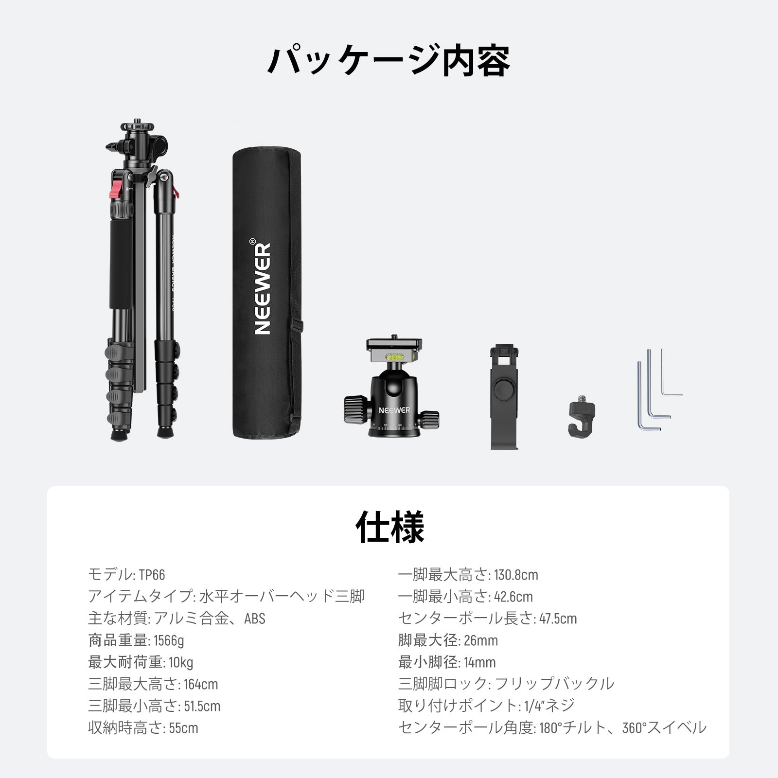 - 【NEEWER BASICS シリーズ】NEEWER BASICS シリーズは、シンプルで実用性に優れたシリーズで、基本的な機能とデザインに基づいて、不要な追加機能や素材がありません。TP66水平オーバーヘッド三脚は、高さ51.5cm-164cm範囲で調整可能で、持ち運びやすくパワフルで、デュアルカメラセットアップ用に設計され、最大10kg機材を支え、360°パン、180°チルトが可能です。三脚は一脚(42.6cm-130.8cm)にも変換でき、様々なシーンに対応します。