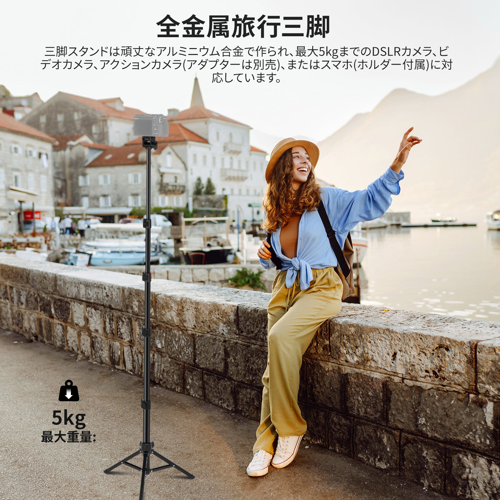 - 【全金属製スマホ&カメラ用トラベル三脚】プロな軽量スタンドは、頑丈なアルミニウム合金で作られ、最大5kgまでのDSLRカメラ、ビデオカメラ、アクションカメラ(アダプターは別売)、スマホ(ホルダーは付属)をサポートします。重さは630g、5段階の18"/45cmから66"/167cmまで調節可能な高さ、卓上スタンドから自撮り棒に簡単に変換できます。YouTube動画、ポートレート、自撮り、生放送、ビデオ撮影、ジム/ゴルフ記録、映画制作などに最適です。
