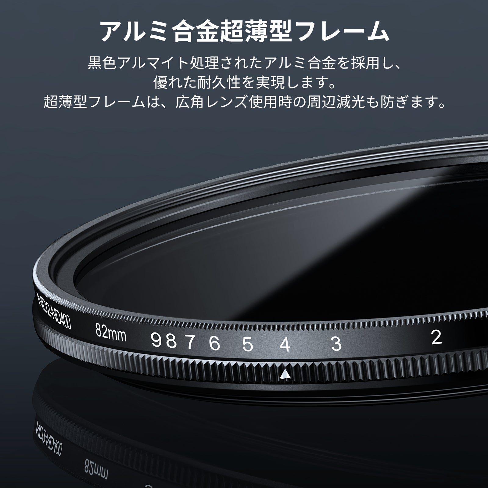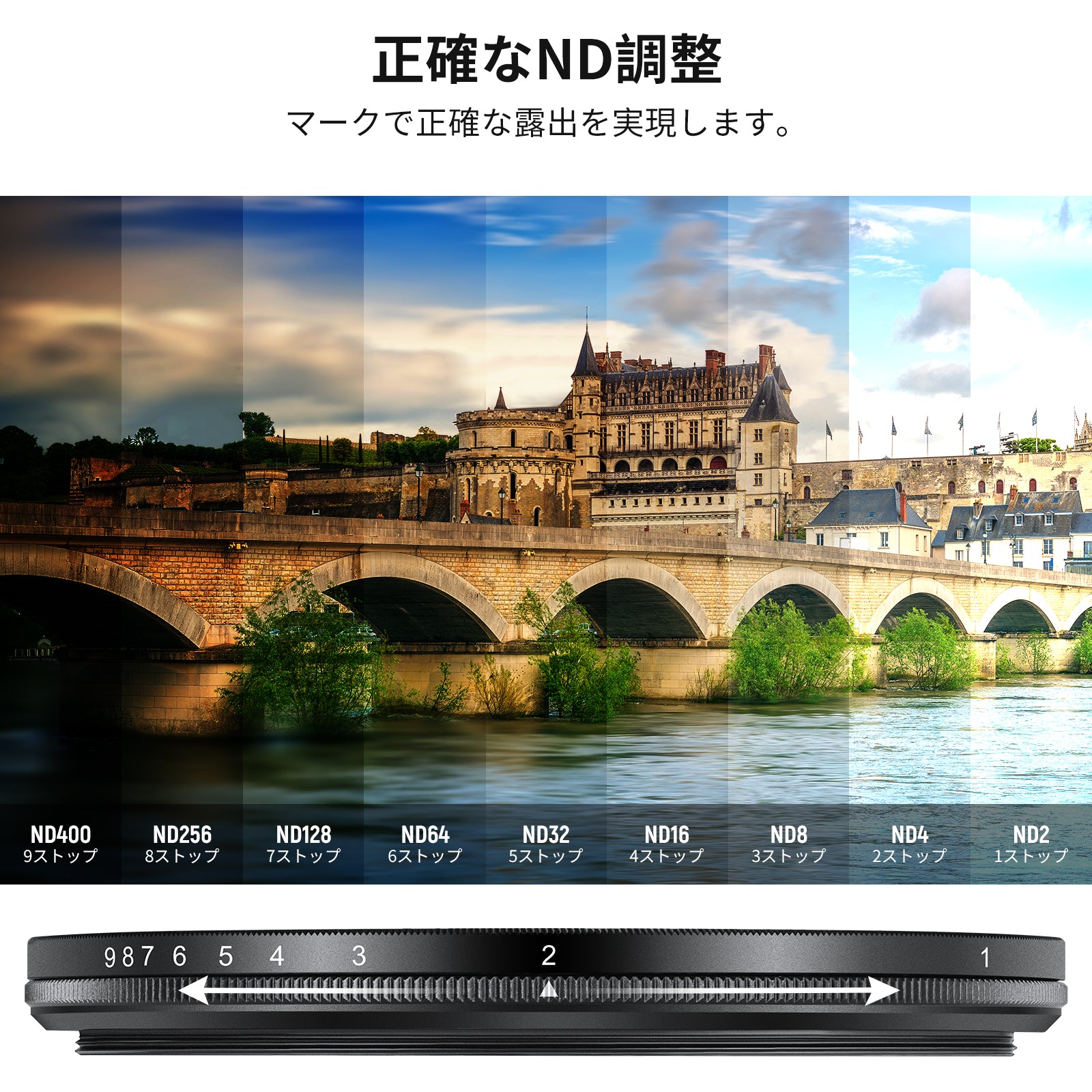 - 【柔軟な減光】可変ND2-400フィルターは、1-9ストップ減光効果を発揮します。様々な天気条件において露出オーバーを防ぎ、低速シャッタースピードと広い絞り値を使用し、モーションブラー効果を効果的に捉えられます。。フレームを正確な位置まで回転させるだけで、正確な露出制御が可能です。