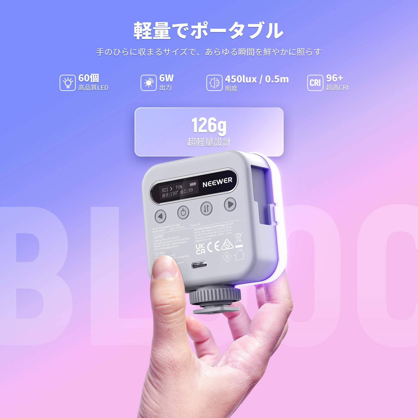 - 【コンパクト&ポータブルカメラライト】BL60Cはポケットサイズのカメラ用ミニLEDビデオライトで、サイズは2.56"x2.56"x1.06"(65x65x27mm)、ディフューザーを含む重量はわずか126gです。カメラを重くすることなく、キーライトやフィルライトとして美しい瞬間を簡単に撮影できます。シンプルな物理ボタンで照明制御を効率化し、ソーシャルメディアコンテンツクリエイター、ライブストリーマー、インフルエンサーに最適です。