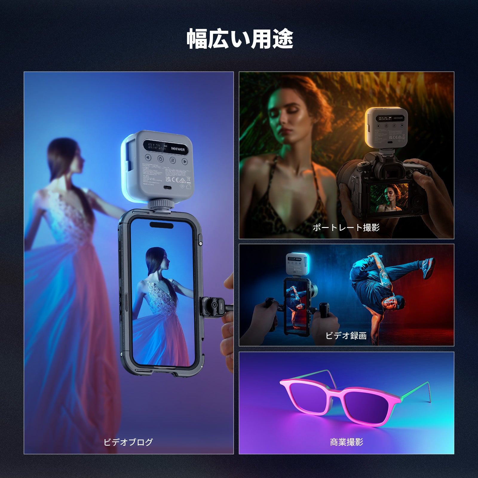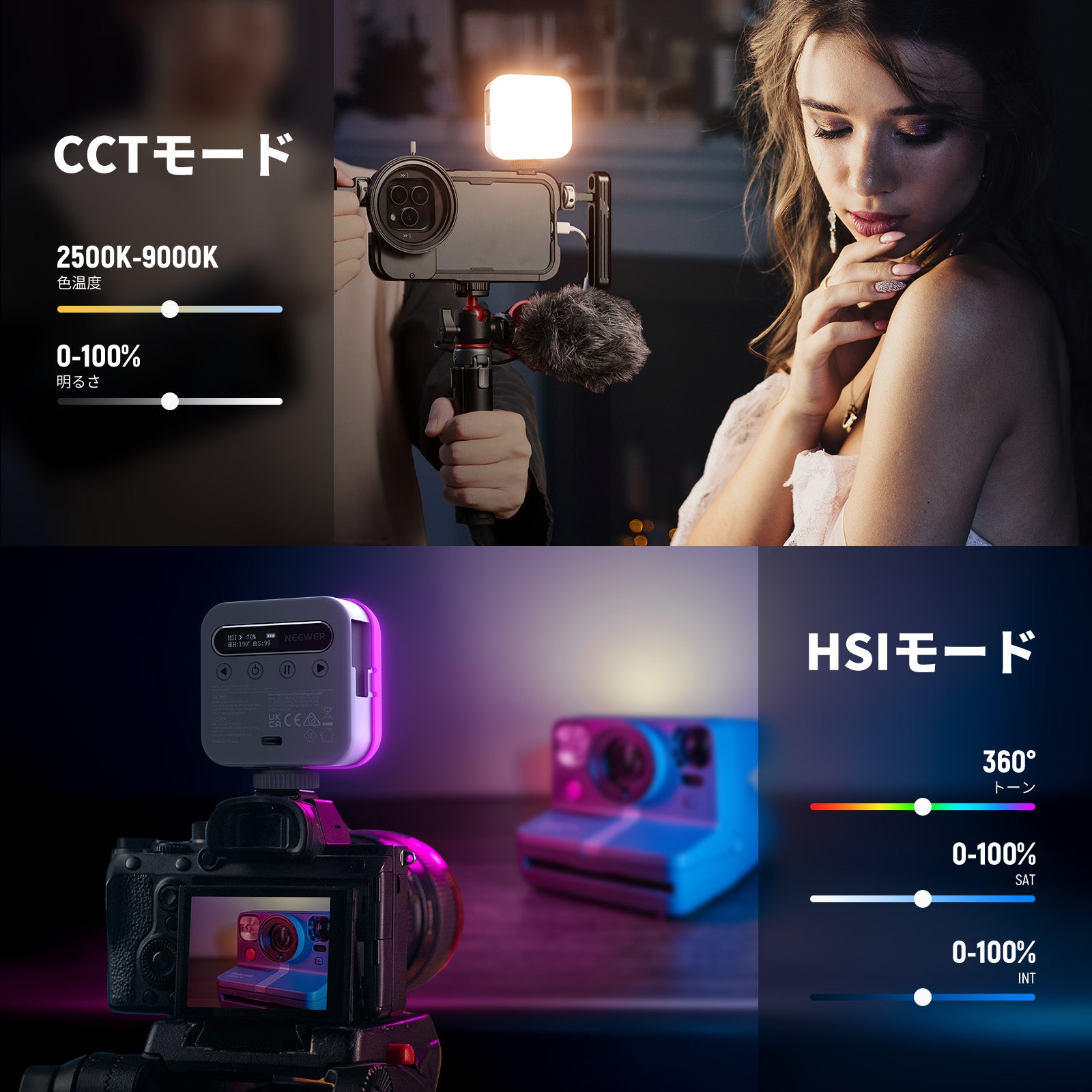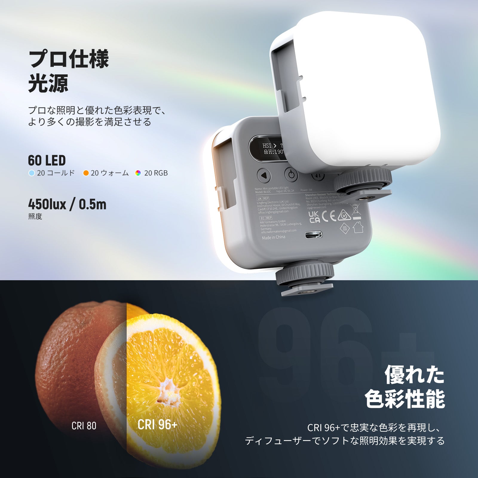 - 【プロ用カメラ照明キット】BL60Cは、20個温白色、20個冷白色、20個RGB LEDを統合した光源を備え、0.5mで450lxの照度を提供します。暖色光と寒色光をシームレスに切り替え、360°完全なRGBカラーを提供し、ポートレート写真、静物、自撮り、TikTok vlog、撮影、生放送、ビデオ撮影、スタジオ写真撮影などの照明ニーズを満たします。高いCRI96+は正確な色再現を保証し、ソフトな照明のためのディフューザーも付属しています。