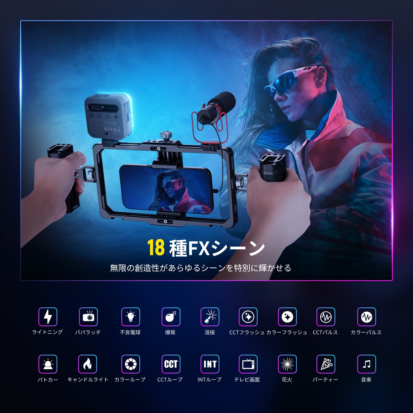 FXモード(18種類のシーン効果):雷、パパラッチ、不良電球、爆発、電気溶接、CCTフリッカー、カラーフリッカー、CCTパルス、カラーパルス、パトカー、キャンドルライト、カラーループ、CCTループ、輝度ループ、スクリーン、花火、パーティー、音楽