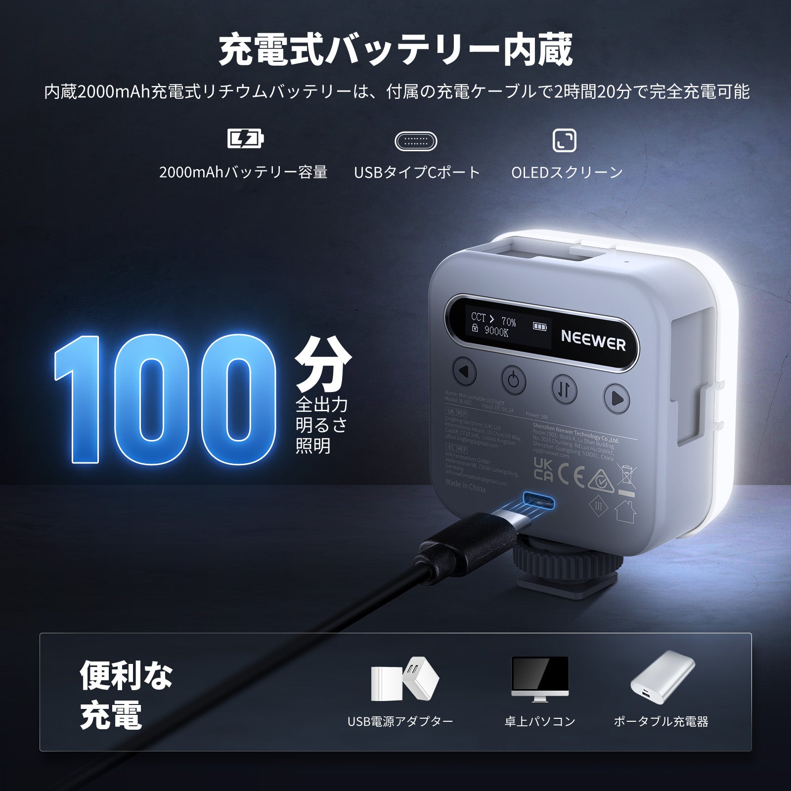 【2000mAh充電式バッテリー】LED RGBカメラライトは2000mAh充電式リチウム電池を内蔵しており、100%明るさで最大100分の連続点灯が可能です。付属の充電ケーブルで2時間20分以内に完全充電できます。