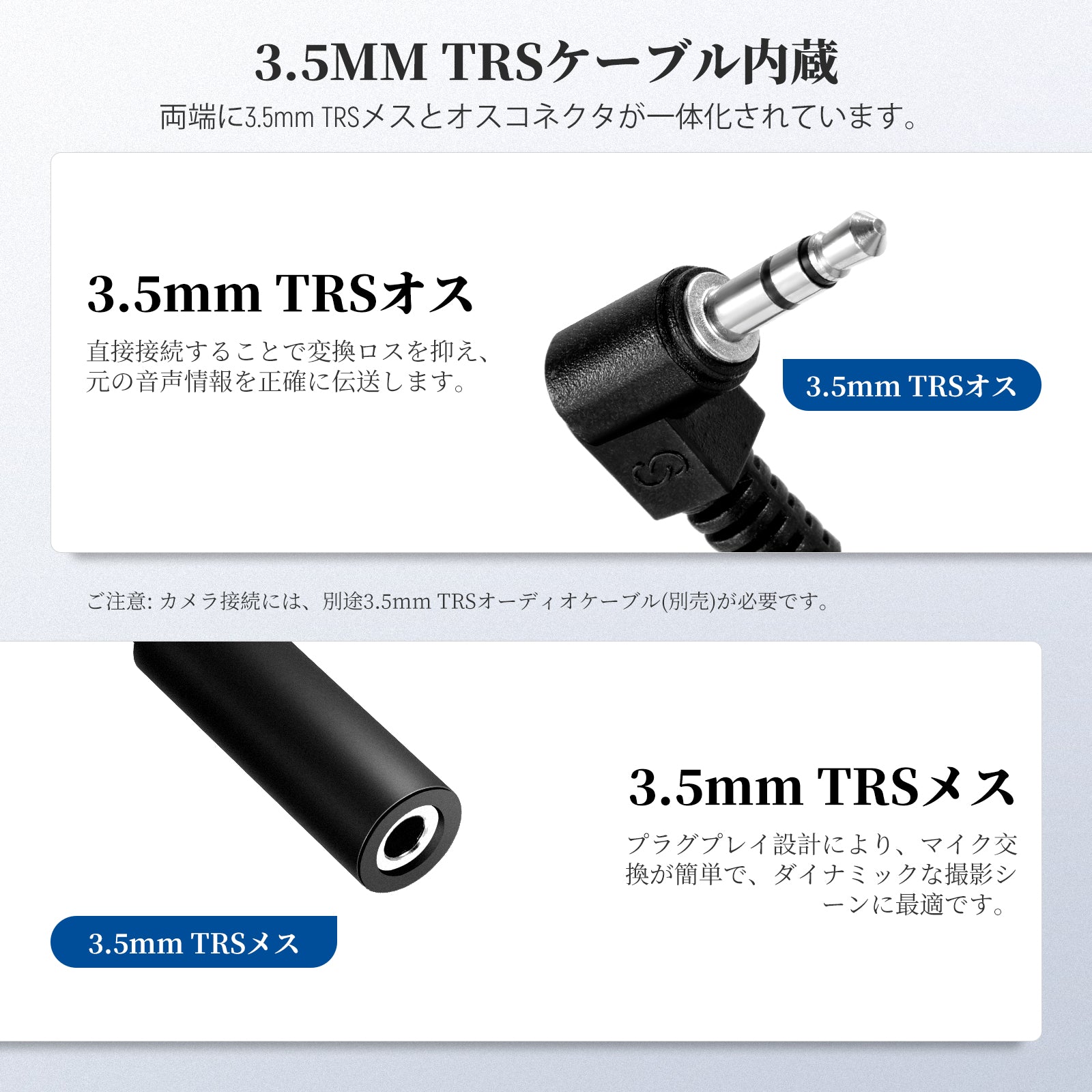 - 【3.5mm TRSケーブル内蔵】3.5mm TRSオス-メスケーブルが内蔵されており、マイクとカメラ/ビデオカメラの接続が簡単です。オスコネクタをマイクに、メスコネクタをカメラに接続します。ご注意: カメラ接続には、3.5mm TRSオーディオケーブル(別売)が必要です。