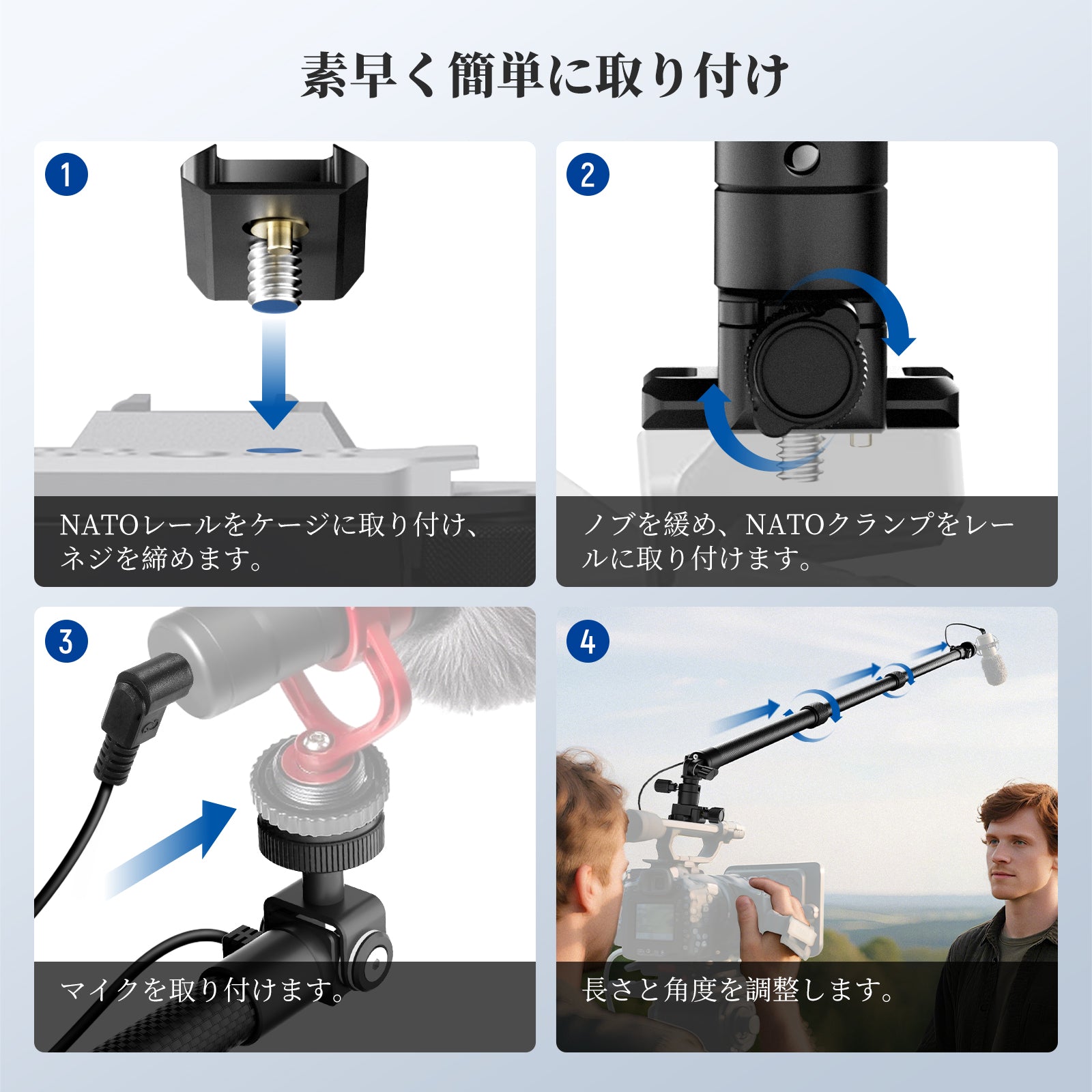 - 【NATOレールへの素早い取り付け】ブームポールは、NATOレールとNATOクランプを備え、カメラケージ、ビデオリグ、ショルダーリグに素早く接続します。 NATOレールが付属していないリグの場合は、1/4"ネジ付き外部NATOレールが付属しており、いつでも素早く簡単に取り付けられます。