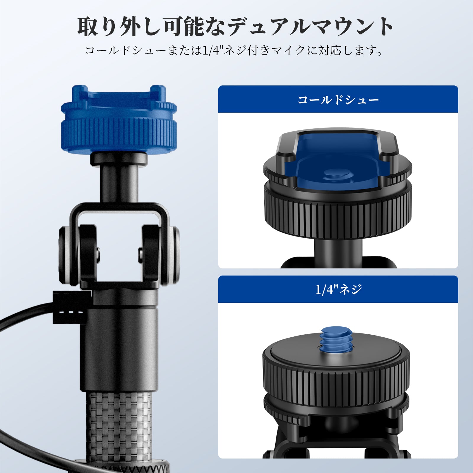 【コールドシュー&1/4"ネジ】上部は2 in 1設計を採用しています。コールドシューはカメラマイクを接続し、1/4"ネジ(コールドシューを取り外した後)はプロ仕様オーディオ機器を接続します。