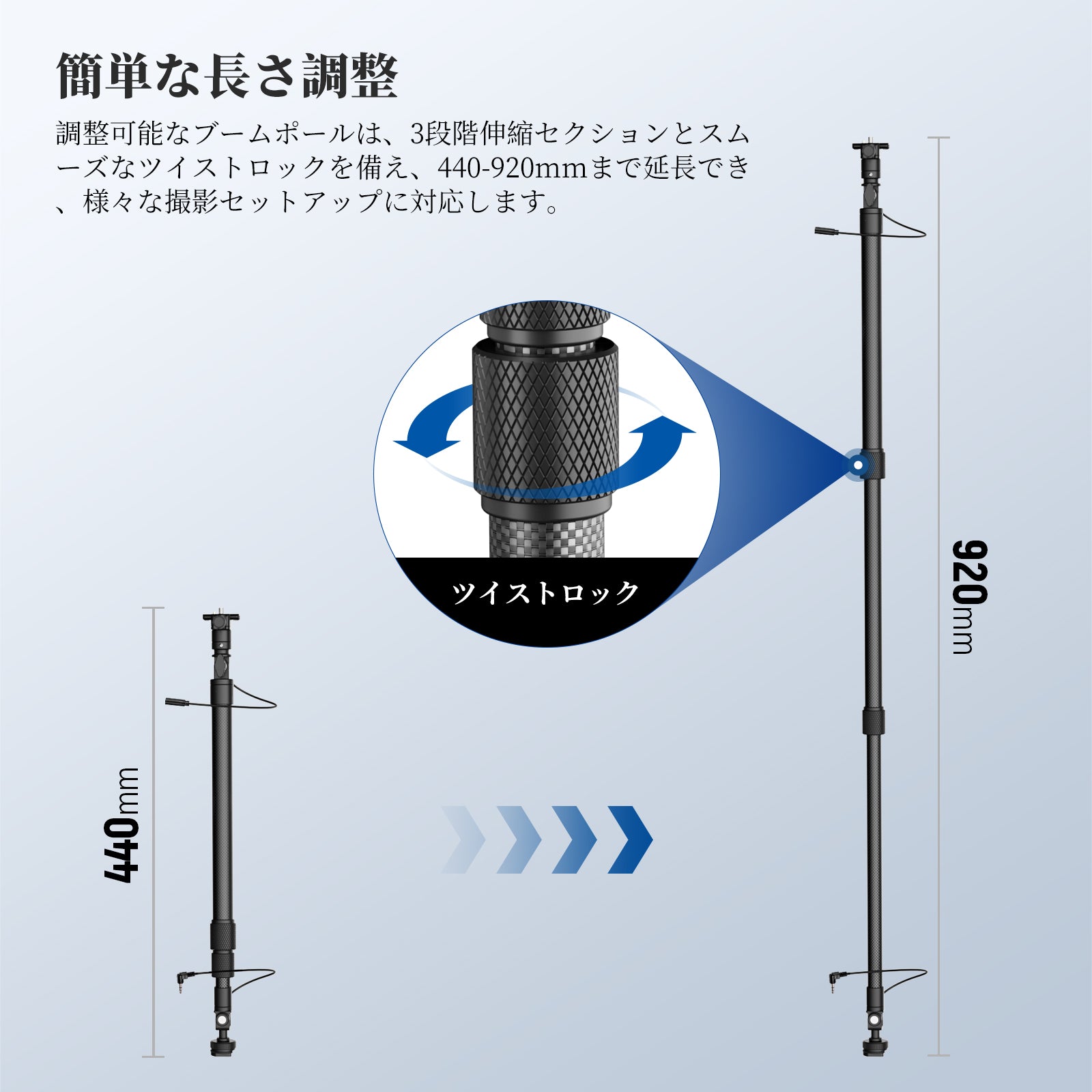 - 【簡単な長さ調整】調整可能なブームポールは3つ伸縮セクションとスムーズなツイストロックを備え、44cm-92cmまで伸縮可能で、様々な撮影環境に対応します。ご注意: 調整後はツイストロックをしっかりと締め、ケーブルが引っ込まないようにしてください。