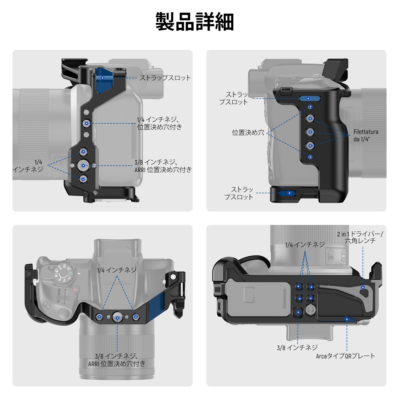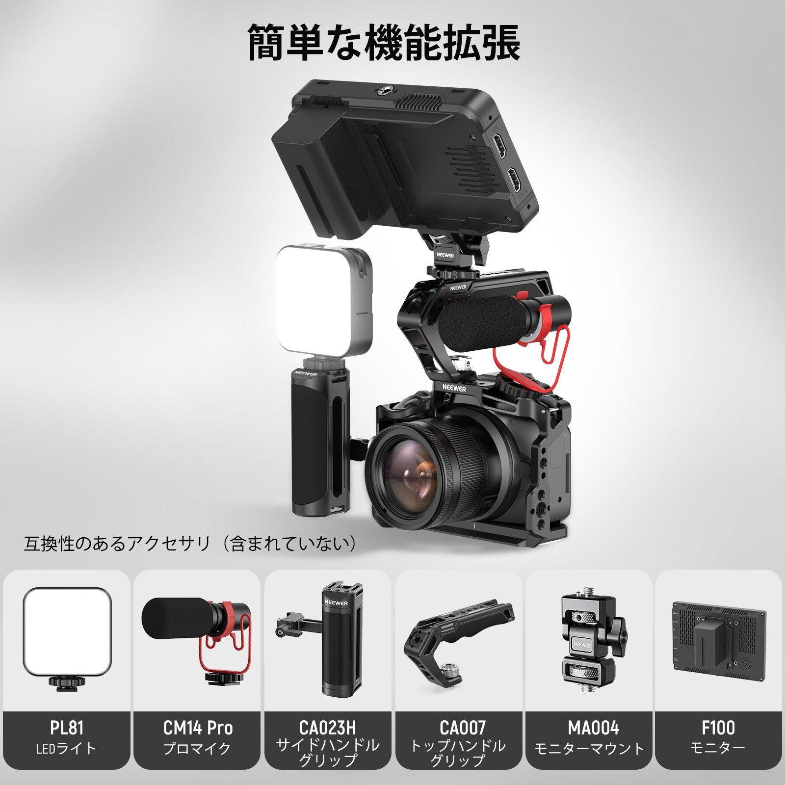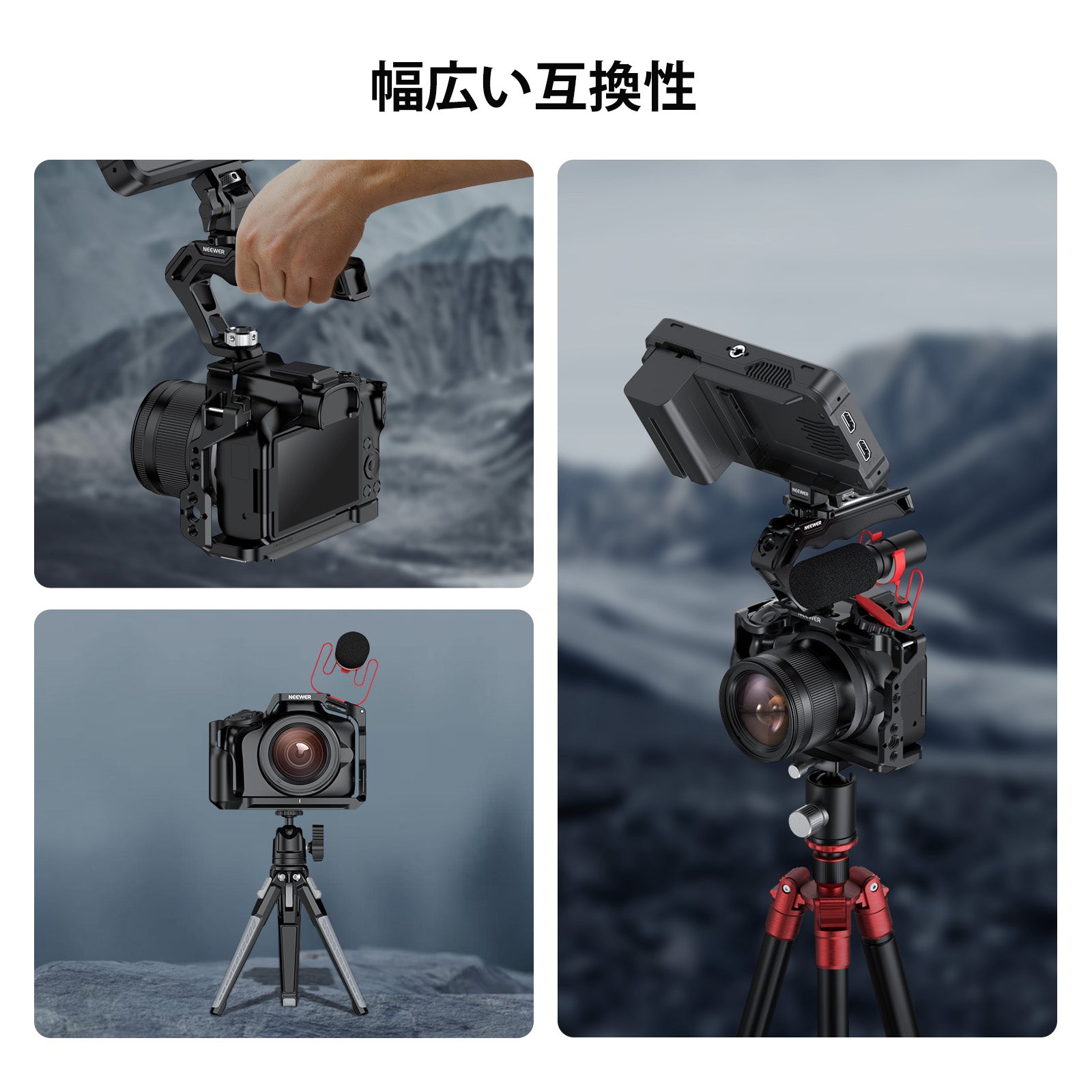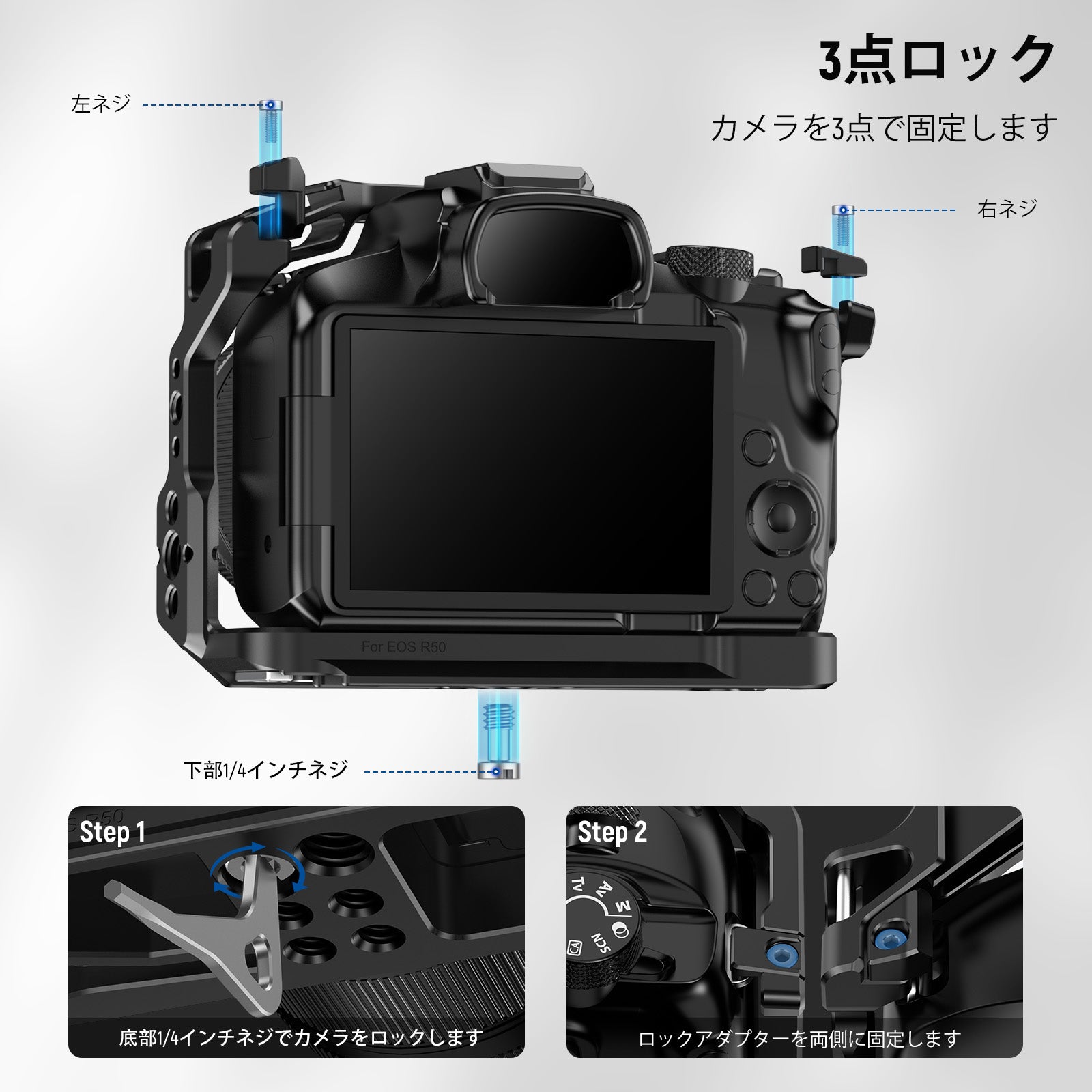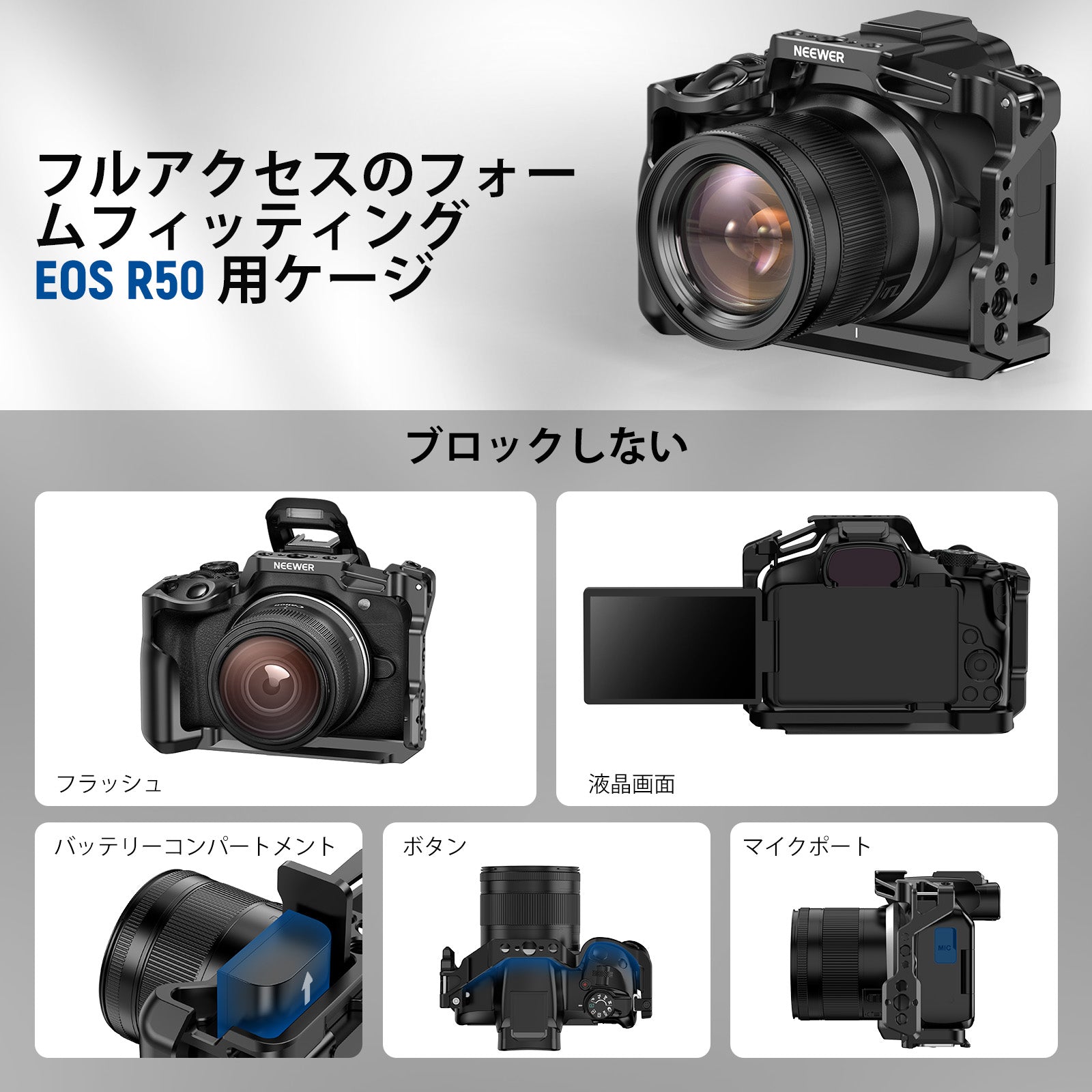【EOS R50にフィットするデザイン】このぴったりフィットする金属製カメラケージは、EOS R50 カメラに対応し、カメラ本体を保護するだけでなく、ポート、ボタン、内蔵フラッシュ、バッテリーコンパートメント、および多関節 LCD スクリーンに完全にアクセスできます。さらに、撮影を強化する複数のアクセサリ取り付けポイントを提供します。
