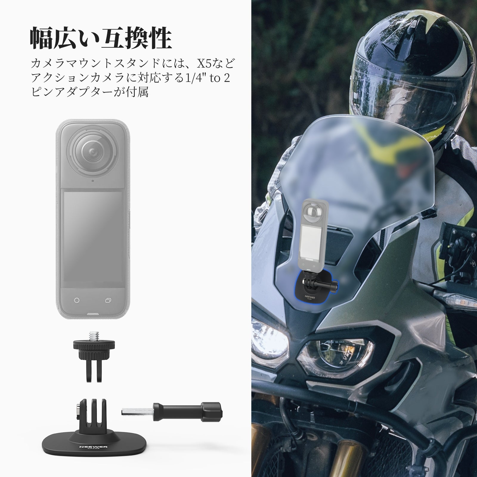 - 【平面&曲面対応】X5カメラマウントは、テーブル、パドルボード、ヘルメット、スケートボードなど平面およびわずかに曲面のある表面向けに設計されています。ヘルメットマウントや車載マウントとしても使用可能で、あらゆるシーンで冒険の瞬間を簡単に撮影できます。