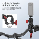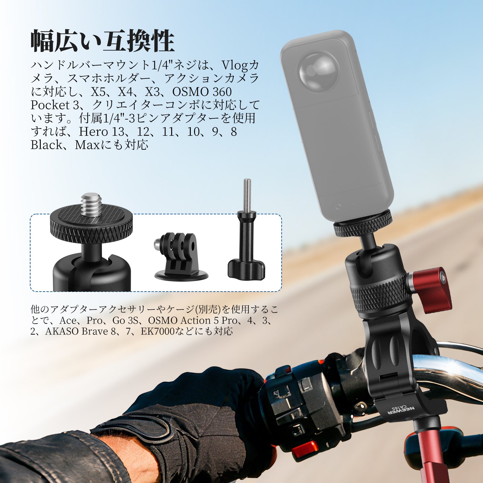 - 【アクションカメラに最適】バイク/自転車ハンドルバーマウントキットは、写真撮影用アクセサリーとして、Hero 13、12、11、10、9、Black Max、Osmo Action 5 Pro、4、AKASO Brave 8、7、EK7000に対応します。2本爪アタッチメント(別売)も装着可能で、Pocket 3、2、クリエイターコンボ、X5、X4、X3、Ace Pro、Go 3Sなどに対応します。