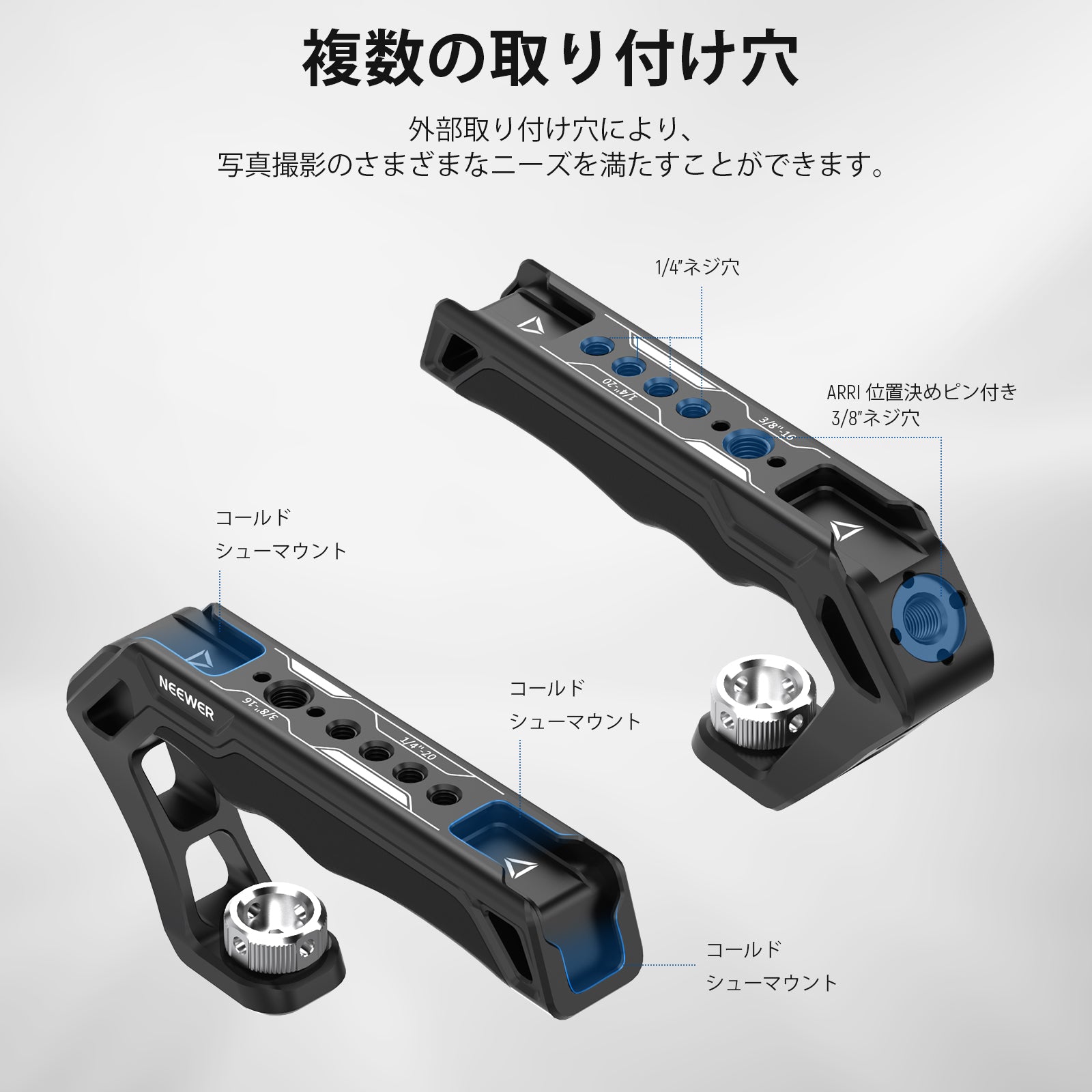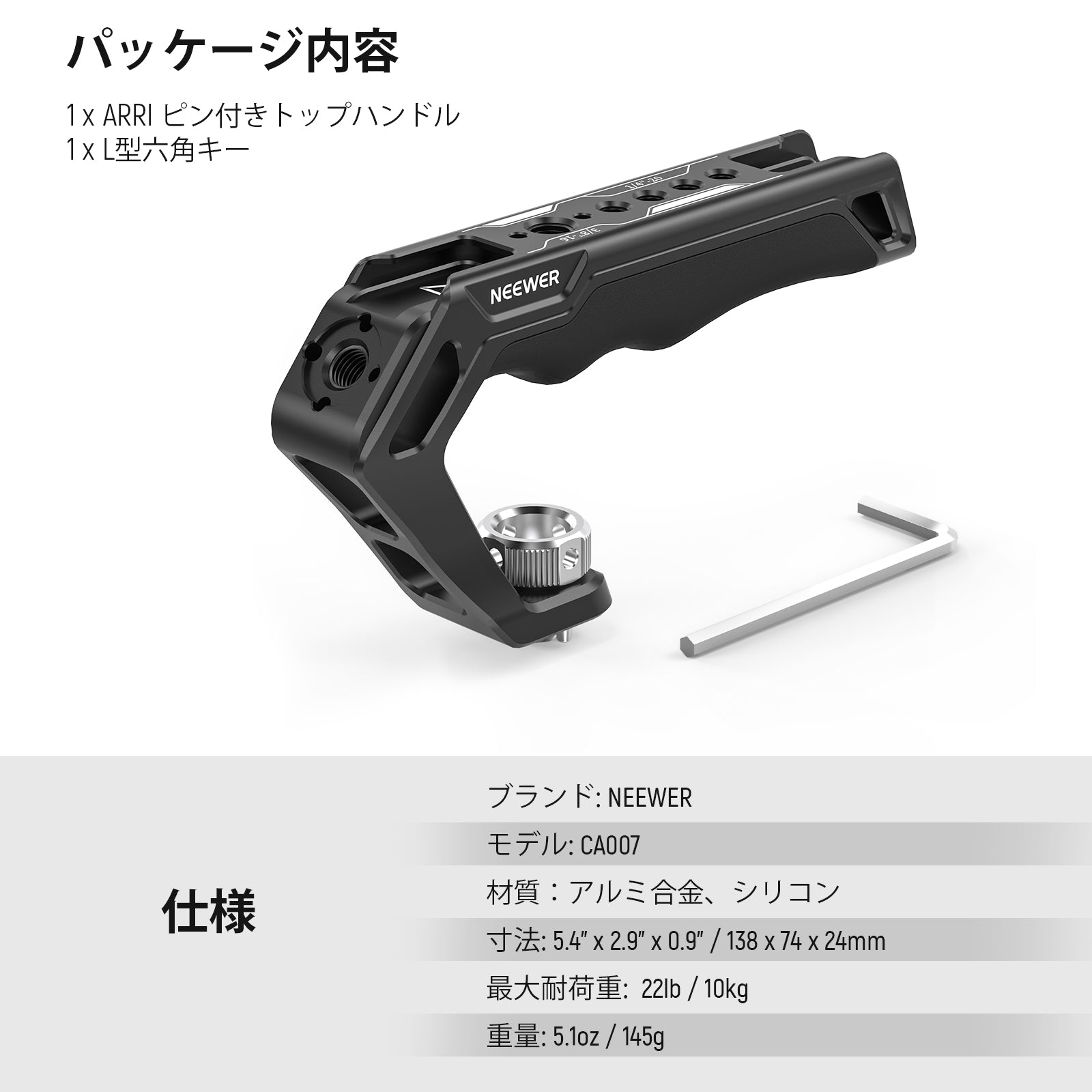 【安全な取り付け】NEEWER CA007トップハンドルは、3/8"ネジとARRI 位置決めピンでカメラケージに取り付けることができ、最大耐荷重は22lb/10kgです。L字型の六角キーが付属しており、ネジをさらに締めて安全性をさらに高めることができます。標準のARRI 位置決め穴を備えたケージに対応します。