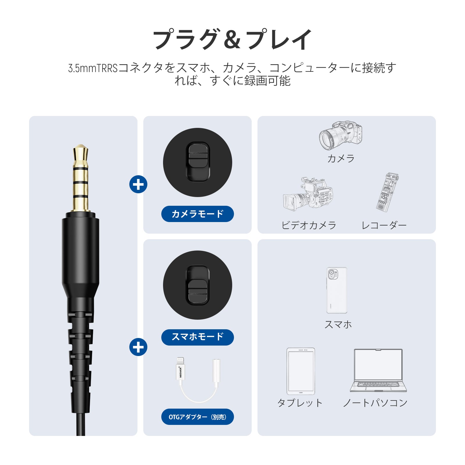 - 【スマホ/カメラ用プラグ&プレイマイク】ミニマイクを3.5mm TRRSコネクタでスマホ、カメラ、コンピューター、ラップトップに接続するだけで、すぐにプロな録音ができます。電池やドライバーは必要ありません。「カメラ/スマホ」スイッチにより、さまざまなデバイスで録音するときにシームレスに適応できます。
