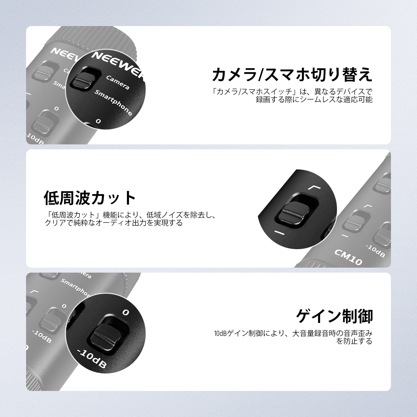 - 【低周波カットとゲイン制御】「低周波カット」機能により、低域ノイズを除去し、ククリアで純粋な音声出力を実現します。また、-10dBのゲイン制御により、大きな音源を録音する際の音声の歪みを防ぎます。