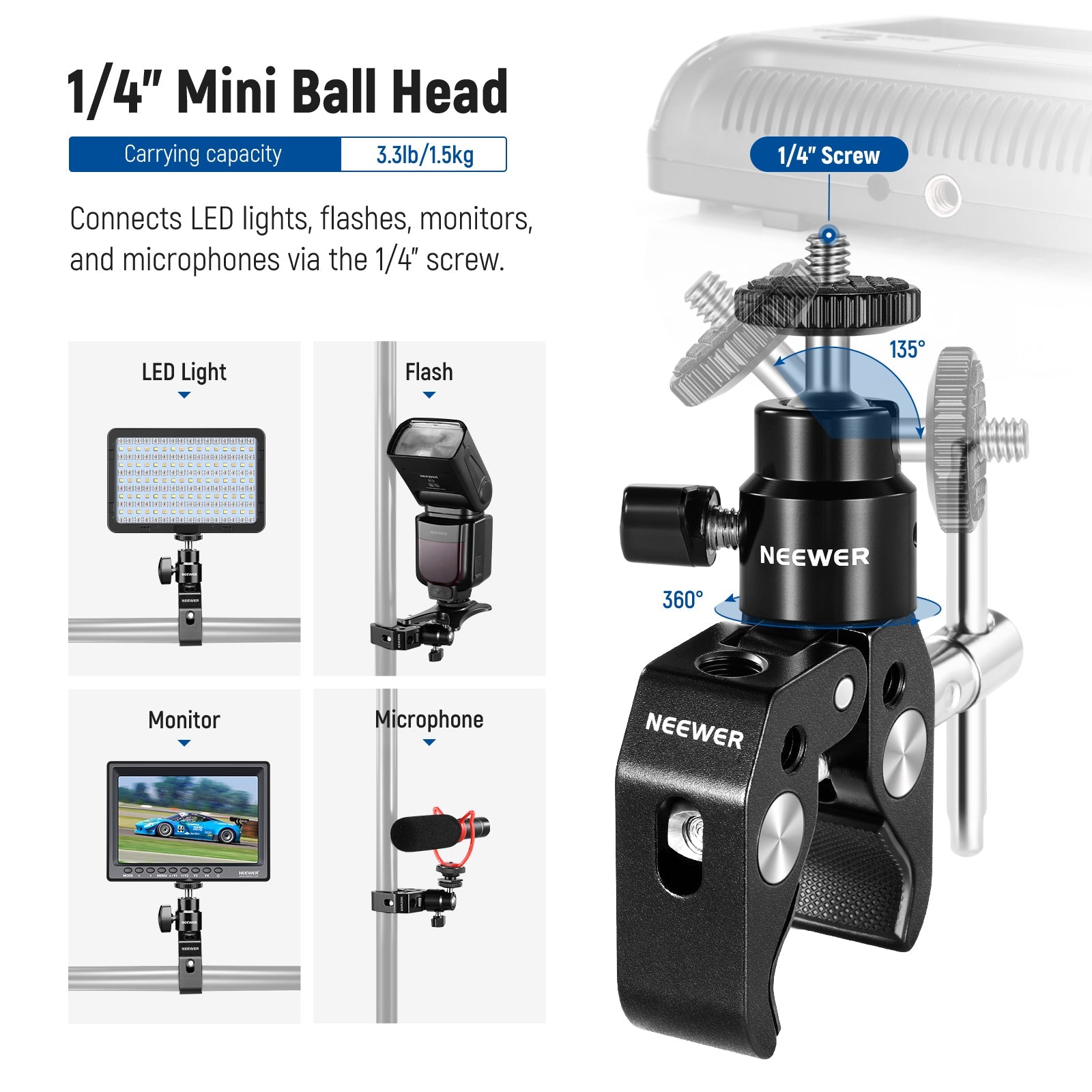 【頑丈なカニクランプ】NEEWER マイクマウントは主に高強度アルミニウム合金製で、頑丈で耐久性に優れています。顎の最大開口部は 2.05"/52mm です。三脚、傘、フック、自転車、棚、テーブル、クロスバーなどに取り付けることができます。滑り止めのゴム製クッションはデバイスの傷を防ぐことができます。