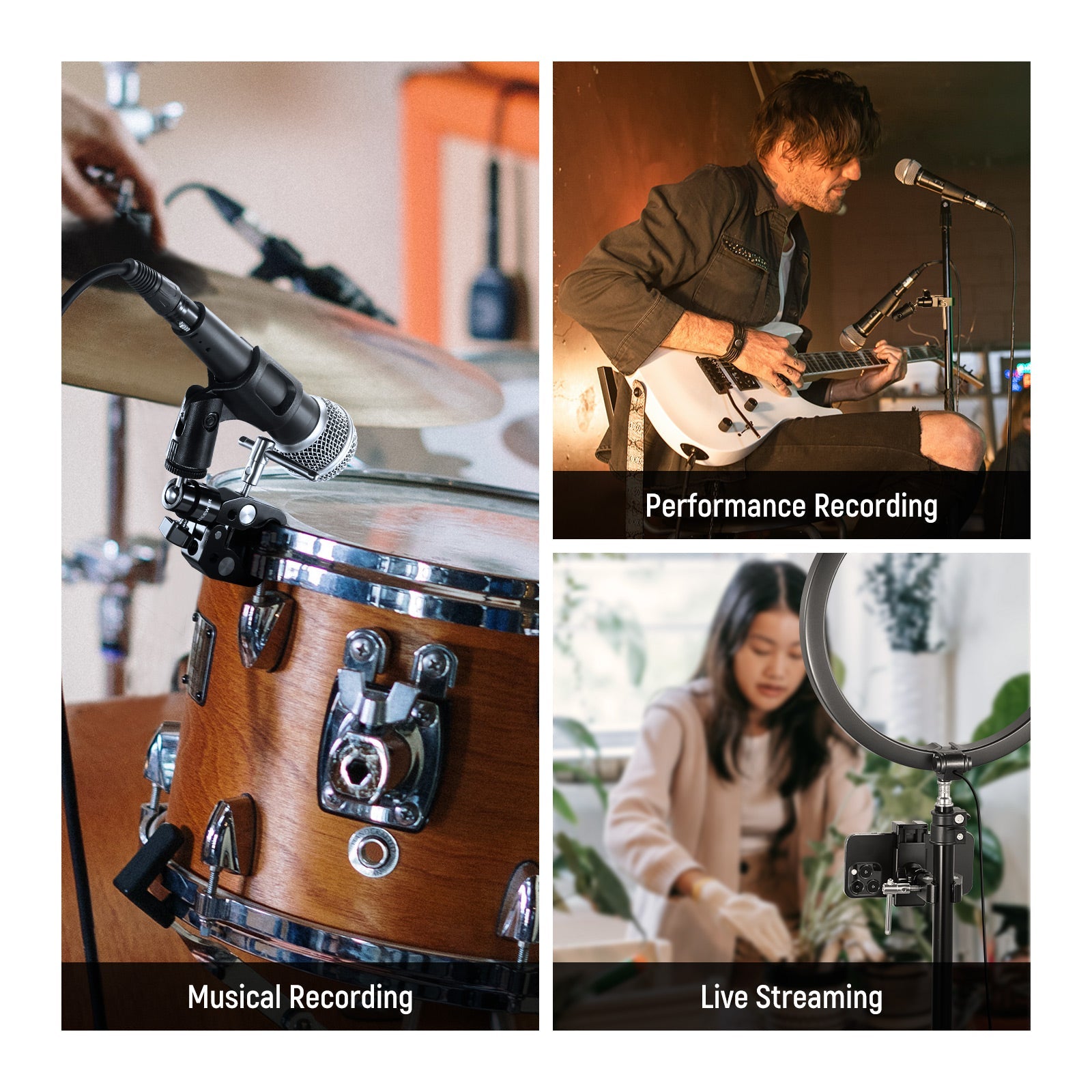 【1/4インチ~5/8インチネジ】ボールヘッドの上部にある標準の5/8インチネジ(1/4インチメスから5/8インチコネクター付き)は、マイクに対応できます。