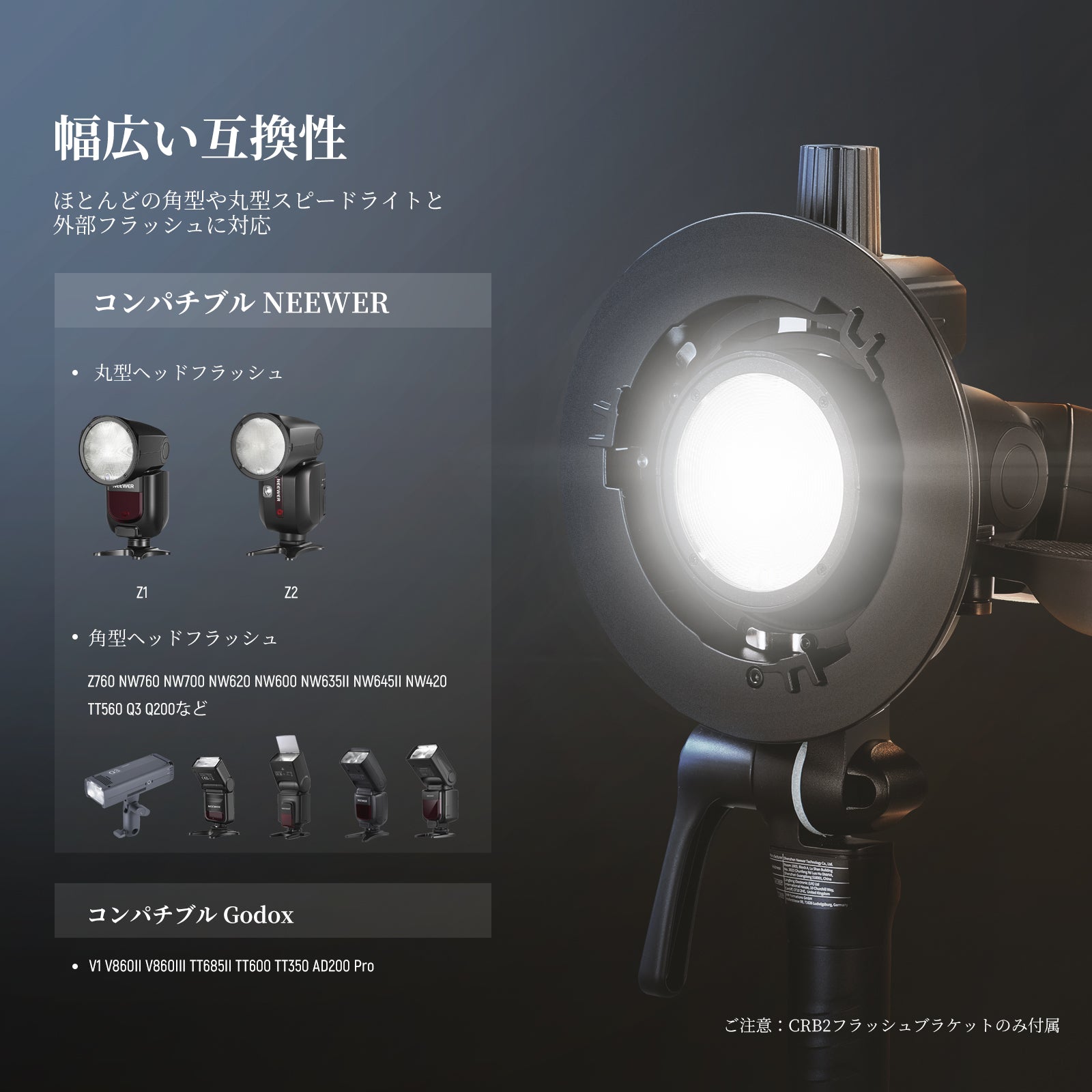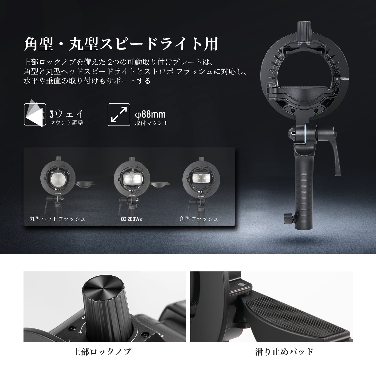 - 【角型・丸型ヘッドフラッシュ用】2つの可動式マウンティングプレートとトップロックノブは、角型、丸型ヘッドのスピードライトやストロボフラッシュに対応し、水平または垂直の取り付けもサポートします。フラッシュブラケットは、コンパチブル Godox V1 V860II V860III TT685II TT600 TT350 AD200 Pro NEEWER Z2 Z1 Z760 NW760 NW700 NW620 NW600 NW635II NW645II NW420 TT560 Q3 Q200など。ゴムパッドがフラッシュを傷から守ります。