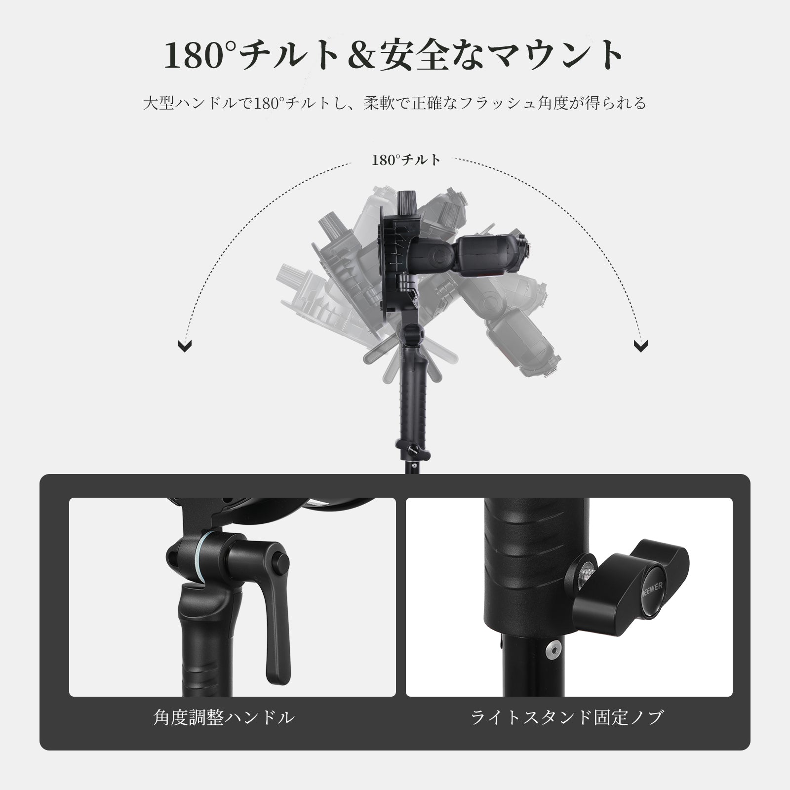 - 【安全な取り付け&180°スムーズ傾斜】マウントプレートと上部のロックノブにより、スピードライトを効率的かつ確実に取り付け、基本的なフラッシュブラケットよりも信頼性が高くなります。大型の金属製レバーにより、フラッシュとライトモディファイアーを希望の角度に正確に 180 度傾けます。