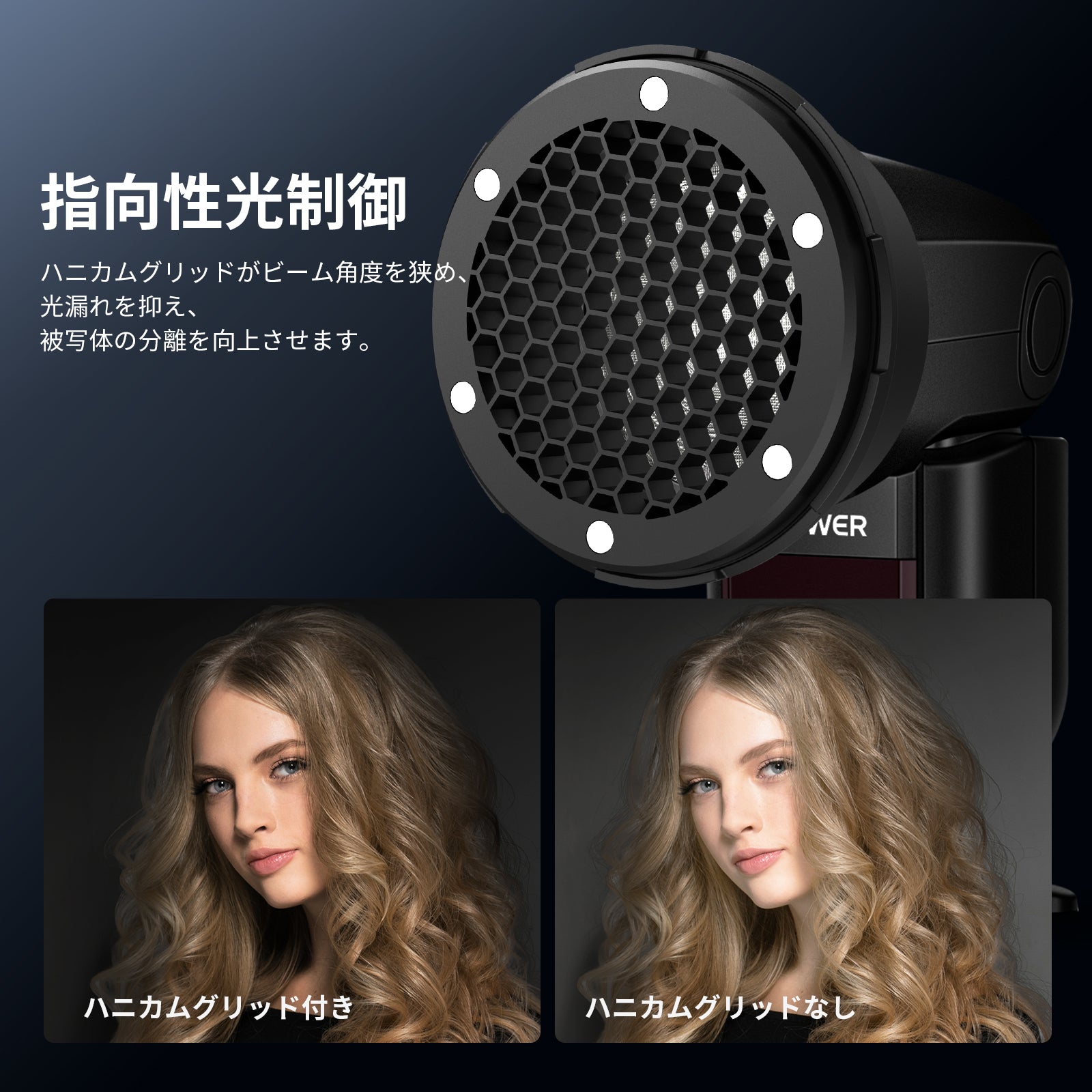 - 【ハニカムグリッド付き指向性照明】ハニカムグリッドは光の広がりを制御し、奥行きを与えます。ビーム角を狭め、光漏れを抑え、被写体の分離を強調し、よりドラマチックで焦点の合ったライティングを実現します。