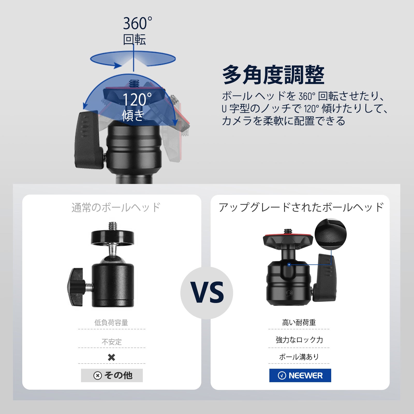【360°回転ボールヘッド】ボールヘッドは360°の回転と120°のチルト動作を提供し、柔軟な角度配置が可能です。ロッキングノブでボールヘッドを理想的な角度で固定します。