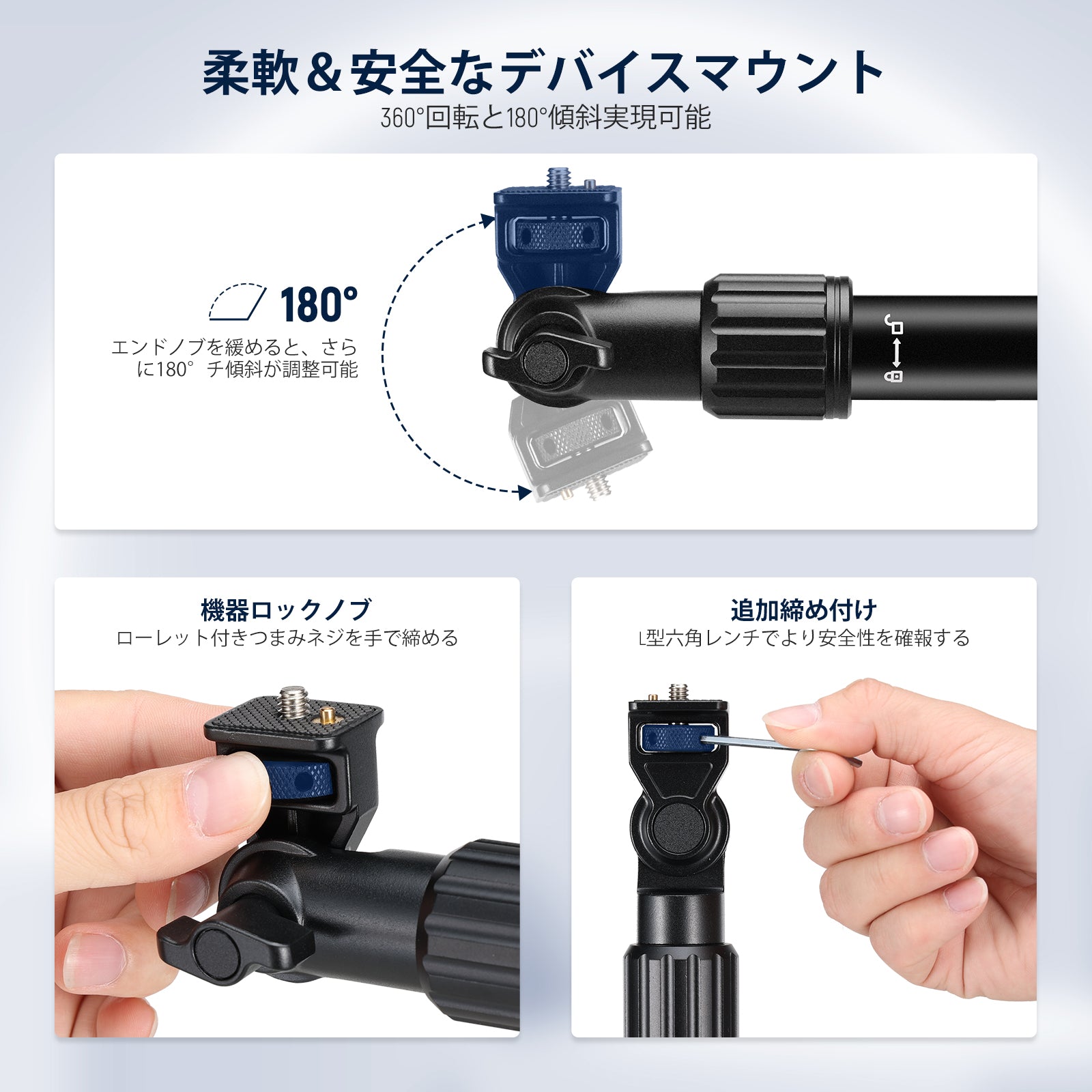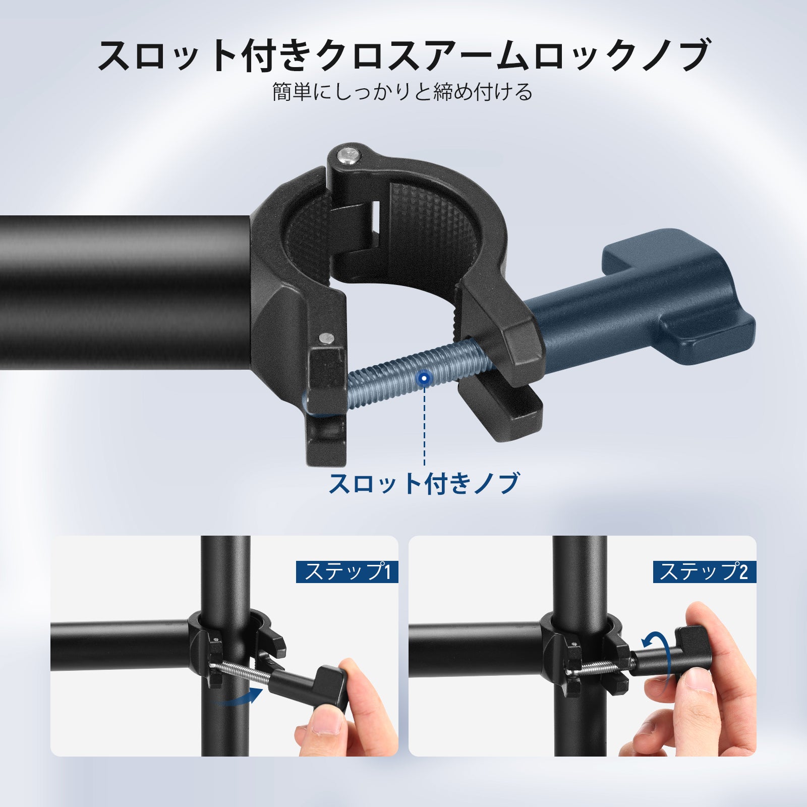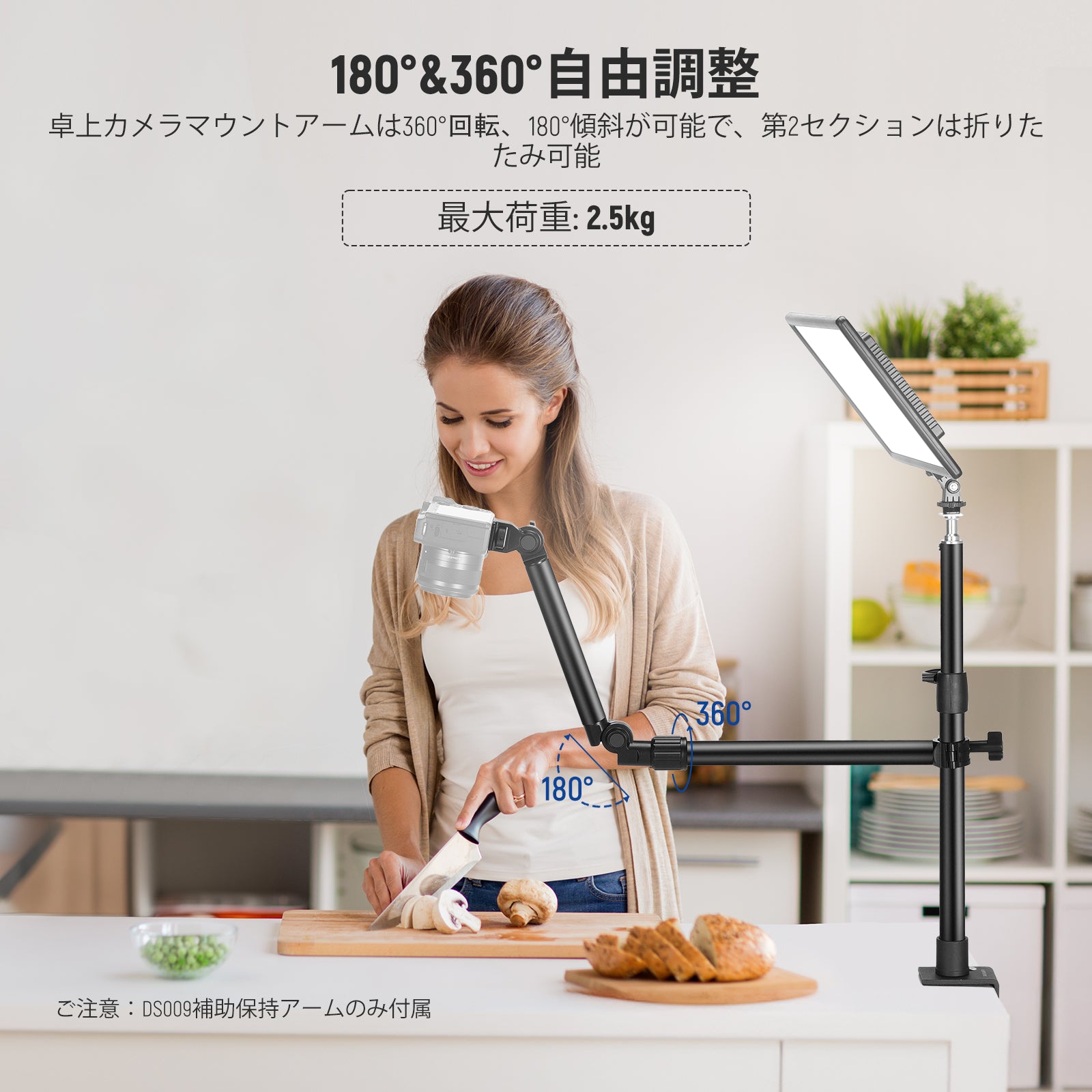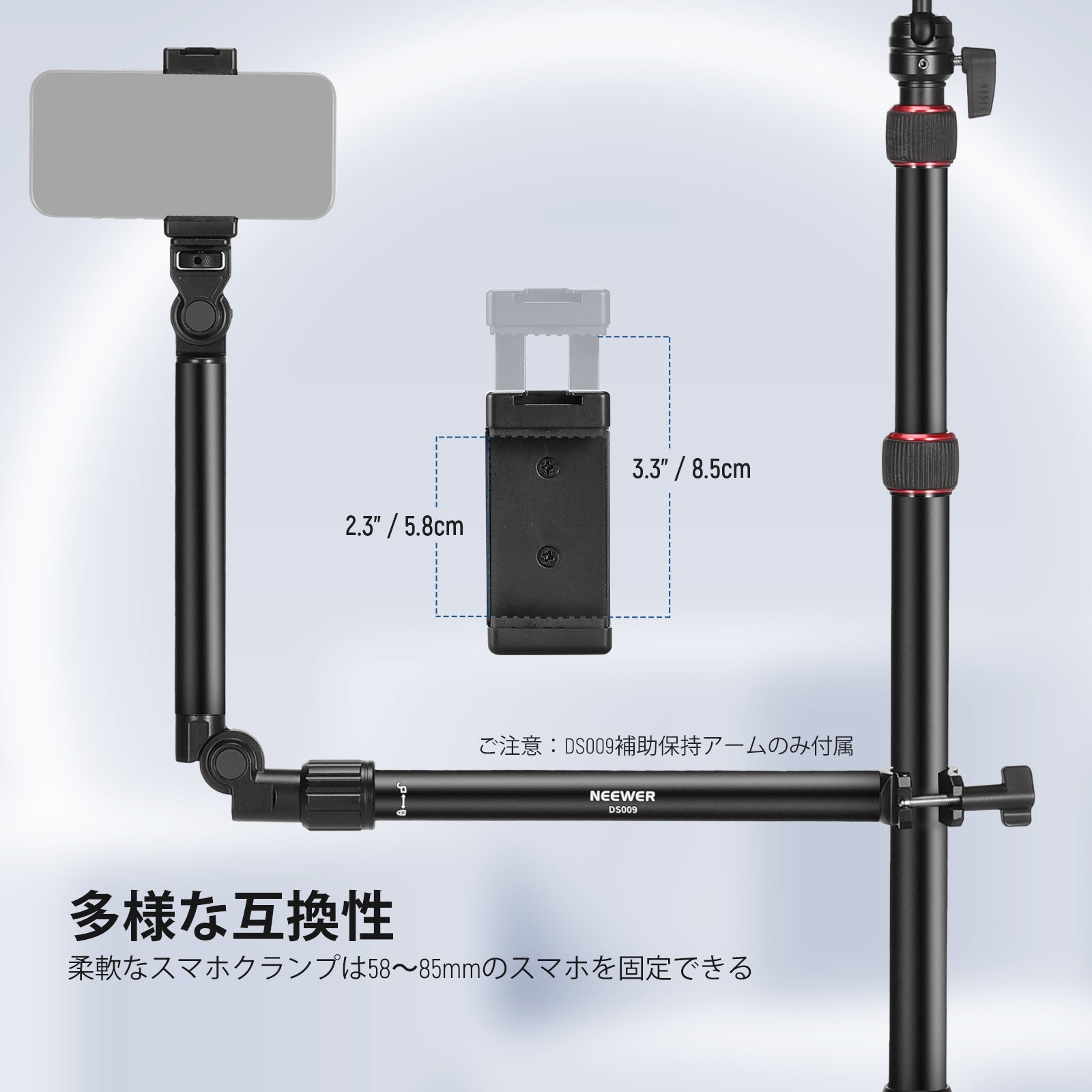 • 【柔軟な卓上スタンド拡張】長さ22"/56cmの2段式補助、保持アームは、俯瞰撮影用のデスクスタンドに水平に設置できるように設計されており、カメラ、ウェブカメラ、フィルライト、リングライト、マイクを簡単に設置できるようにセットアップを拡張する柔軟性を提供します。デスクカメラマウントアームには、2.3"~3.3"/58~85mm以内のスマホを固定するスマホクリップも付属しています。