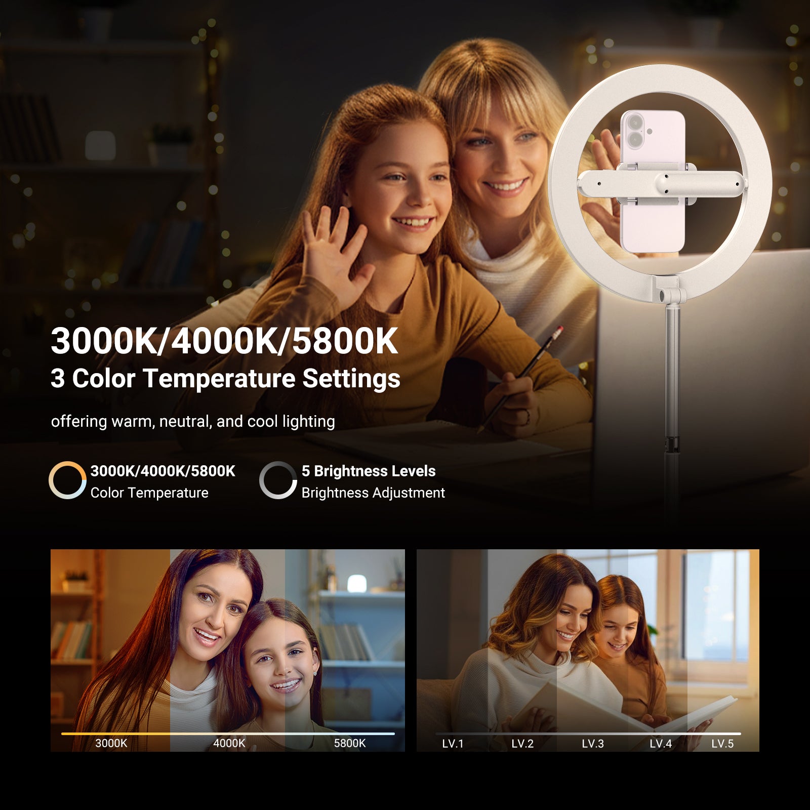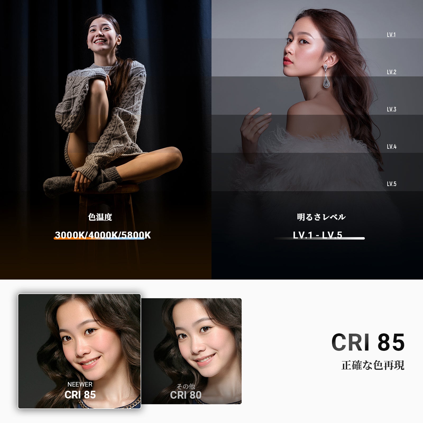 - 【3色モード&5段階調光】N16 10インチLEDリングライトは144個の高品質LED(暖色・寒色)を搭載し、最大830ルクス/0.5mの照度とCRI85+の演色性を実現。暖色・自然光・寒色の3モードと5段階の明るさ調整で、あらゆる肌色を美しく引き立てます。柔らかく均一な光が瞳に輝きを与え、ハードシャドウを効果的に軽減。YouTube/TikTok動画制作、メイクアップアーティスト、エステティシャン、まつげエクステンション、タトゥー、動画収録、ポッドキャスト、ライブ配信、写真撮影、自撮り、Vlog制作まで、多彩なシーンで活躍します。