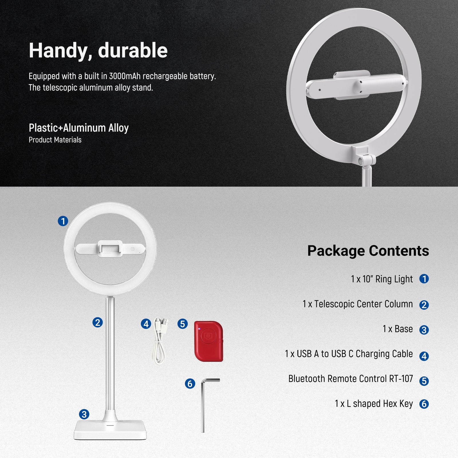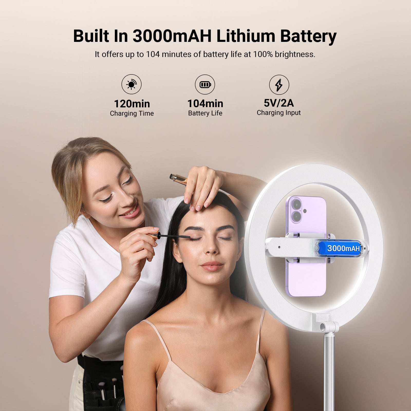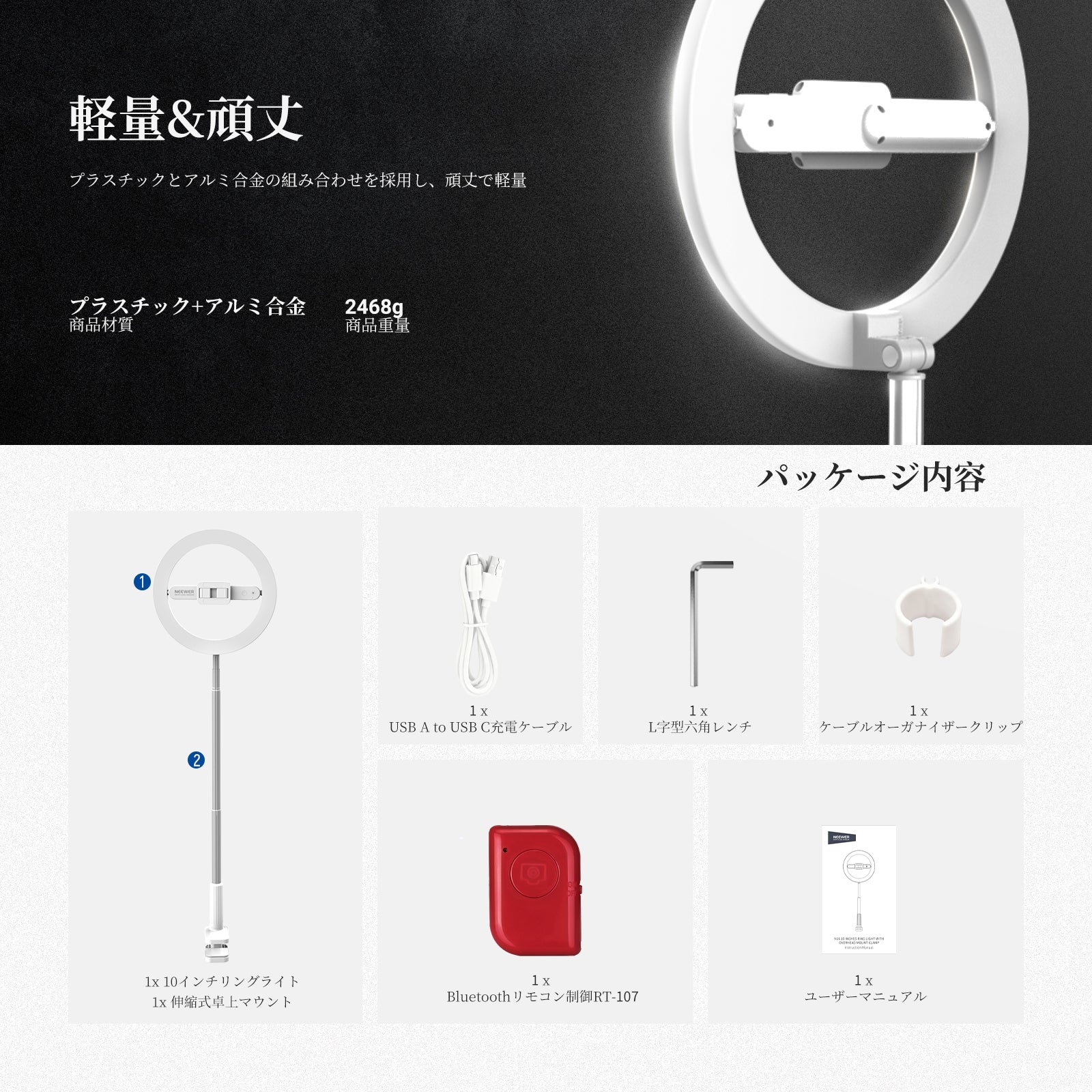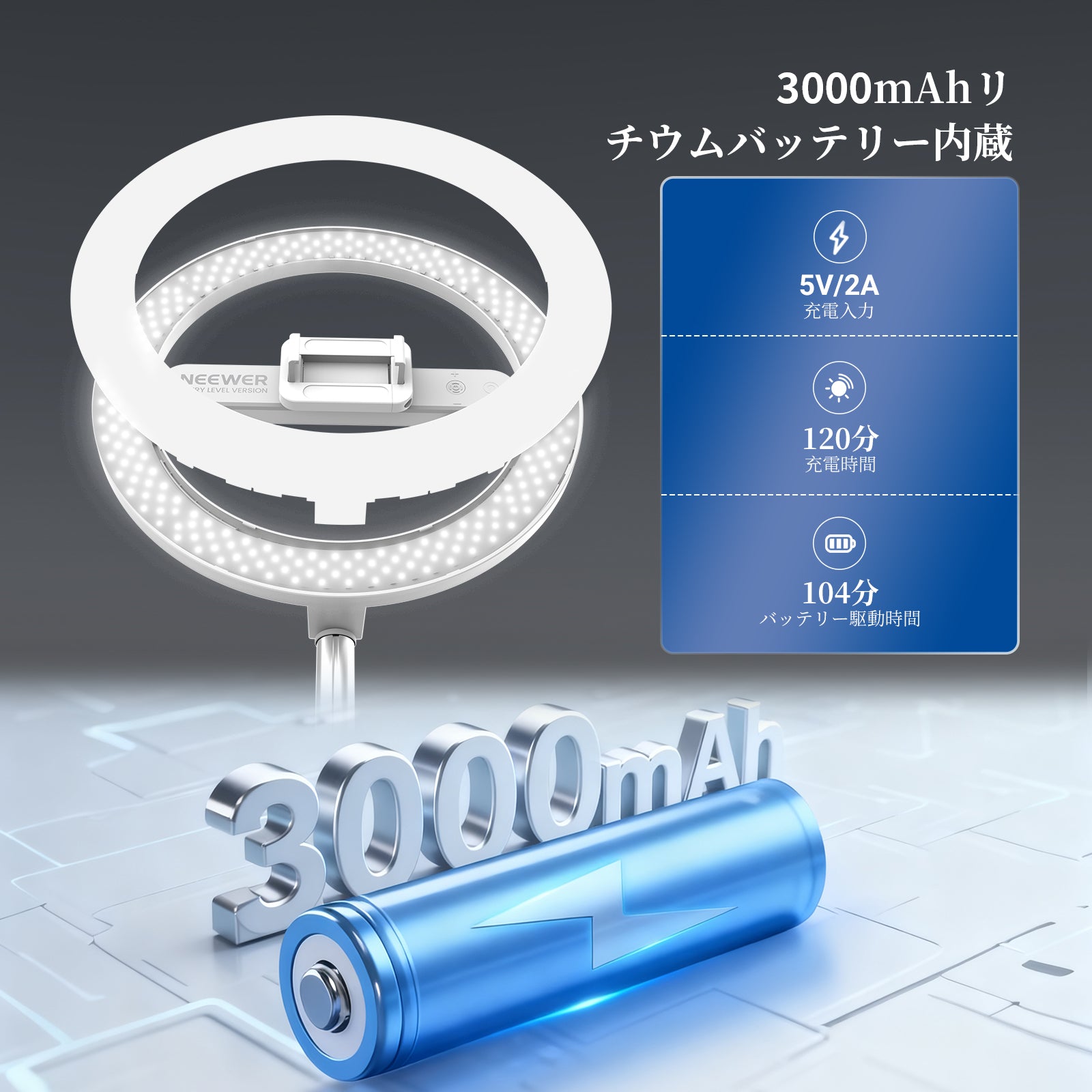 - 【大容量3000mAhバッテリー&USB給電対応】ポータブル卓上リングライトは、3000mAhの充電式バッテリーを内蔵。最大輝度で約104分間の連続使用が可能です。5V/2Aまたは5V/1AのUSB給電にも対応し、SNSインフルエンサーにとって必須の、途切れない連続照明を提供します。ご注意:バッテリー寿命を最大限に延ばすため、初回ご使用前に満充電されることを推奨します。