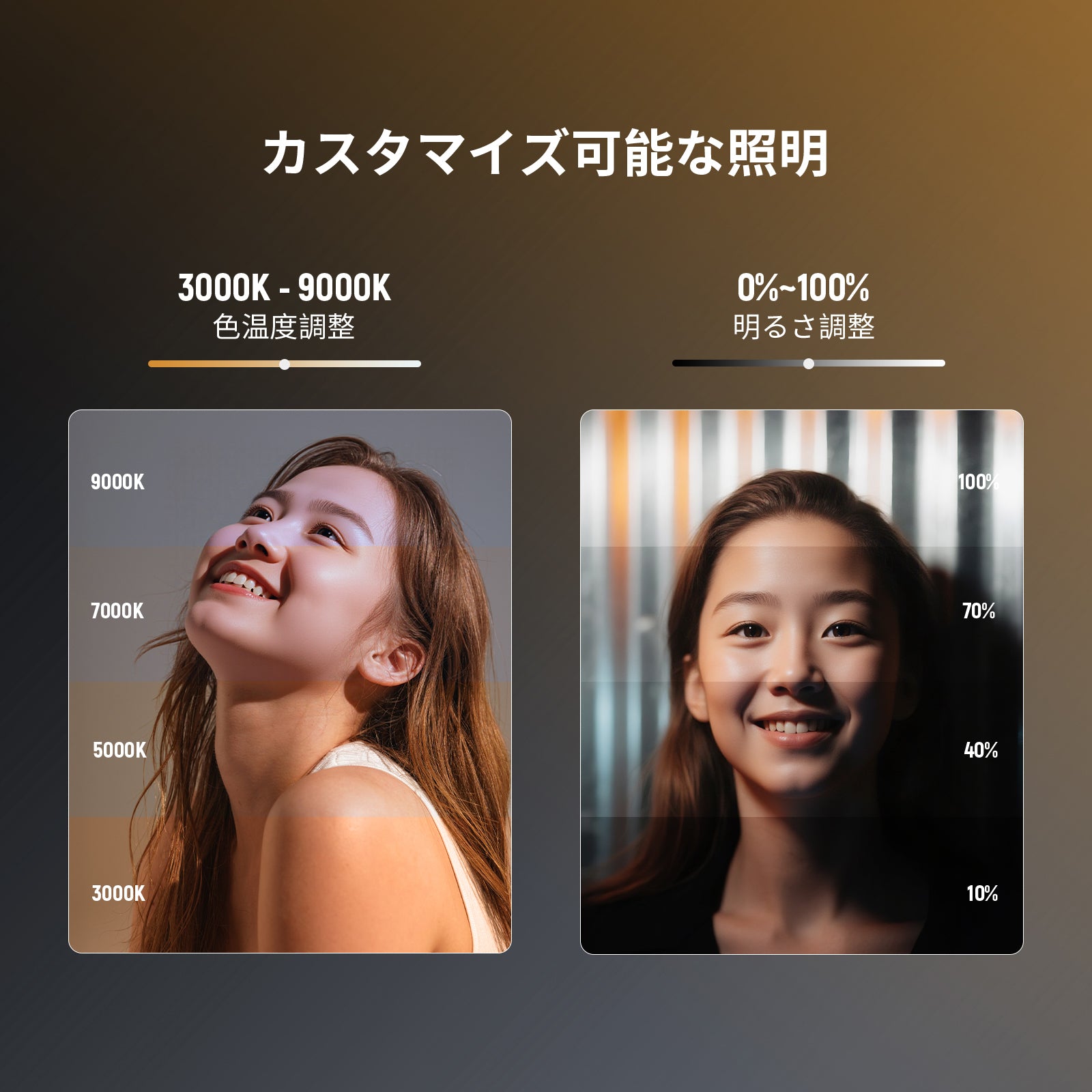 - 【カスタマイズ照明可能】LEDカメラライトは、96個高品質LED(暖色系48個+寒色系48個)を搭載し、ディフューザーを内蔵し、0.5mで最大518lux柔らかく均一な照明を提供します。3000K-9000Kの広色温度範囲と調整可能な明るさは、ポートレート写真、写真撮影、映画撮影、静物撮影、自撮り、YouTube/TikTok vlog、映画撮影、ビデオ録画、生放送、スタジオ撮影など、様々な撮影シナリオに簡単に適応できます。